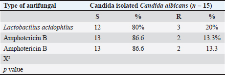 The inhibition results were also compared between Clotrimazole and the inhibitory effect of L. acidophilus bacteria against the isolated C. albicans visually and statistically explained in the Table 6. Table 6. Number of inhibited Candida albicans isolates with Clotrimazole and (CFS) of probiotic Lactobacillus acidophilus at concentration 107.