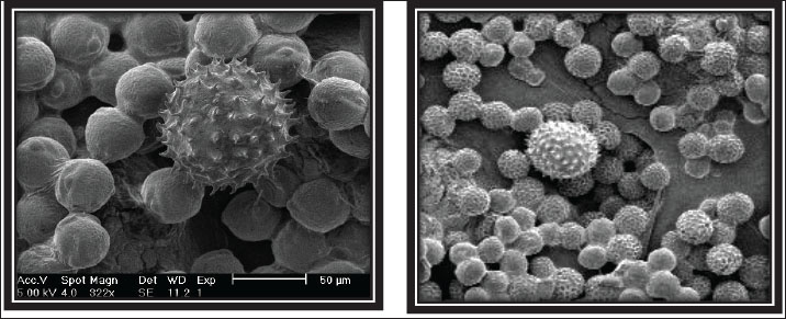 Fig. 2. SEM images comparing cotton pollen (Gossypium hirsutum) with M. quinquenervia (left) and Helianthus annuus L. (right), highlighting differences in grain size and texture. Statistical relationshipsTukey’s honestly significant difference test revealed significant differences in pellet weights among plant species (p < 0.05). Maireana villosa had the highest pellet weight (6.42 mg), while G. hirsutum had the lowest (2.45 mg). A one-way ANOVA revealed a significant effect of the pollen surface texture group (smooth, reticulate, and spiny) on pellet weight (Pearson’s correlation coefficient (r)=0.746, p < 0.05), with the smooth group yielding the heaviest pellets. A strong negative correlation was found between pollen grain size and pellet weight, with Pearson’s correlation coefficient (r)=−0.89, indicating that larger pollen grains were associated with lower pellet weights. This correlation was statistically significant (p < 0.05). However, Spearman’s correlation coefficient was not statistically significant (r=0.455, p > 0.05), suggesting that Pearson’s analysis may have been influenced by outliers, particularly G. hirsutum, which exhibited the largest pollen grains (101 µm) and the lowest pellet weight (2.45 mg). DiscussionThe findings of this 2007 study provide a foundational understanding of pollen foraging preferences, the core principles of which continue to inform apiculture and pollination management. While agricultural landscapes evolve, the fundamental relationships between bee behavior and floral traits documented here remain critical for designing strategies to support pollinators. The highest pollen yield (2.84 kg per colony) in this study occurred between March 18 and 25, coinciding with the peak blooming period of the dominant local flora. This temporal alignment highlights the critical role of environmental factors, such as climate and flowering phenology, in shaping the foraging patterns of honey bees. These findings are consistent with those of previous studies by Dimou and Thrasyvoulou (2007) and Olsen et al. (1979), which emphasized the influence of seasonal floral availability on pollen collection, a relationship that remains a cornerstone of pollinator ecology (Forrest and Thomson, 2019). The observed yield aligned with those of earlier studies. Synge (1947) reported recorded peak-season pollen collection ranging from 1.3 to 1.4 kg per colony, whereas Eckert (1942) documented annual yields reaching up to 55.4 kg under optimal conditions. Vaissière (1991) further contextualized these patterns by showing that daily pollen influxes varied from 3.6 to 143.5 g per colony depending on floral availability. In this study, the average daily influx of 109.0 g indicates favorable foraging conditions, likely driven by abundant floral resources during the peak bloom period. The diversity in flower shape and size among the observed floral sources complicates the assessment of their specific impact on bee preferences. Although flower colors fell within the bees’ preferred spectrum (e.g., yellow, white), morphological variations influenced their foraging behavior. For instance, A. concurrens exhibited clustered, medium-sized flowers (2–4 cm), which offered concentrated resources that improved foraging efficiency. This pattern was consistent with Goodwin (1986) observations and further supported by Johnson and Ackerman (1989), who emphasized that clustered arrangements reduce energy expenditure for pollinators, a concept now integral to planting schemes for pollinator support (Goulson et al., 2015). In contrast, H. annuus’s large, open flowers (25–30 cm) provided easy nectar access, aligning with Waser’s (1986) findings on how floral architecture enhances pollinator attraction. Similarly, Chittka and Waser (1997) reported that larger floral displays improved nectar accessibility. Conversely, smaller flowers, such as cup-shaped T. micrococcus (1–2 cm) and bottlebrush-shaped M. quinquenervia (1–2 cm), optimized feeding efficiency through compact structures, as described by Kearns and Inouye (1993) and corroborated by Goulson et al. (2008), who highlighted the role of flower miniaturization in rapid nectar collection. It is important to note that the large, composite inflorescence of H. annuus presents a fundamentally different visual and structural cue compared to the single flower of cotton, which may confound direct comparisons based on color alone. Brightly colored flowers, such as yellow (A. concurrens, M. villosa) and orange (H. annuus) flowers, strongly stimulated the foraging of honey bees and promoted repeat visits. This is consistent with Buchmann and Nabhan’s (1996) assertion that vivid hues serve as critical visual cues for pollinators. In contrast, creamy-white flowers (G. hirsutum, M. quinquenervia) attracted fewer bees, a pattern consistent with Thomson (2004) observation that muted colors reduce pollinator visitation. Notably, darker blooms did not directly drive foraging preference but likely enhanced floral visibility through landscape contrast, as proposed by Buchmann and Shipman (1990) and Free (1993), who argued that dark hues function as secondary visual markers rather than primary attractants. This is consistent with Dafni (1992) hypothesis that darker pigmentation improves floral detectability under variable light conditions, offering an adaptive advantage in visual signaling systems. Scent, a factor not measured in this study, also plays a crucial role in attraction and could interact with color cues (Raguso, 2008). Recent research has shown that bees evaluate both sugar concentration and viscosity when assessing nectar quality, demonstrating the complexity of foraging decisions (Pattrick et al., 2024). The foraging behavior observed in this study aligns with broader research on the ecology of honey bees in agricultural systems. Sustainable beekeeping practices emphasize the importance of diverse floral resources for maintaining