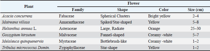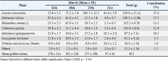 Pollen source preferencesHoney bees collected pollen from a variety of plant species (Table 2), demonstrating significant preferences (F7,28=84.593, p < 0.02) based on floral morphology and pollen characteristics. The most collected pollen was from Black Wattle (Acacia concurrens), which contributed 37.4% (319.6 g) of the total. Second, silver bluebush (Maireana villosa) and sunflower (Helianthus annuus) were significant sources, providing 17.5% (149.3 g) and 13.3% (113.2 g), respectively. An unidentified species ranked third, contributing 12.4% (105.9 g), while Paperbark Tea Tree (Melaleuca quinquenervia) accounted for 10.2% (87.2 g). Cotton (Gossypium hirsutum) and Small Caltrop (Tribulus micrococcus) made smaller contributions of 5.3% and 2.4%, respectively. Minor plant sources collectively accounted for only 1.5% (12.1 g), indicating a limited reliance on less common pollen sources during the study period. Table 2. The major sources of trapped pollen collected by honey bees and flower features.
