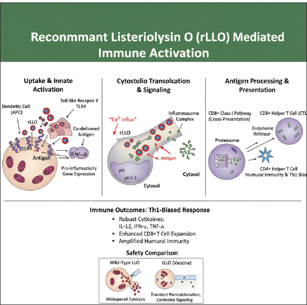 Standard adjuvants, such as alum, CpG oligonucleotides, and bacterial flagellin, stimulate the immune system through well-characterized pattern recognition receptors (PRRs), such as TLR4, TLR9, and NOD-like receptors. In contrast, rLLO promotes immunity via a well-defined mechanism involving the creation of transient pores in cholesterol-rich host cell membranes. This activity initiates NLRP3 inflammasome activation via potassium efflux, ROS generation, and phagosomal disruption and enables cytosolic antigen release, promoting cross-presentation via MHC class I. This twofold role in both innate and adaptive immunity is relatively rare among protein-based adjuvants (Sun and Liu, 2013; Wallecha et al., 2013). Although the interaction of rLLO with cholesterol is well understood, the precise immune-sensing receptors remain unclear. In contrast to adjuvant proteins such as flagellin (TLR5), lipopolysaccharide (TLR4), and CpG DNA (TLR9), which occupy definite PRRs, rLLO's immune stimulation likely depends on secondary mechanisms, including damage-associated molecular patterns (DAMPs), inflammasome priming (Lamkanfi and Dixit, 2014), and cytosolic sensing pathways such as absent in melanoma-2 (AIM-2) or stimulator of interferon genes (STING), though direct indication is motionless deficient (Mandal and Lee, 2002; Wallecha et al., 2013).