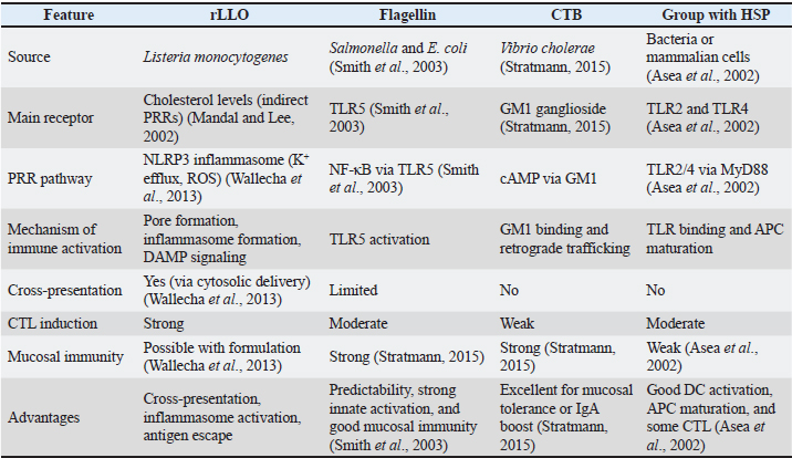 Despite these advantages, rLLO remains underexplored compared with conventional adjuvants, particularly regarding its receptor specificity, immune profile in neonates, and safety in immunocompromised hosts. Defining its molecular targets and comparing them with other immune activators is essential for optimizing its use in next-generation vaccines (Peng et al., 2007). Table 1 shows the comparative characteristics of rLLO and other adjuvant proteins.