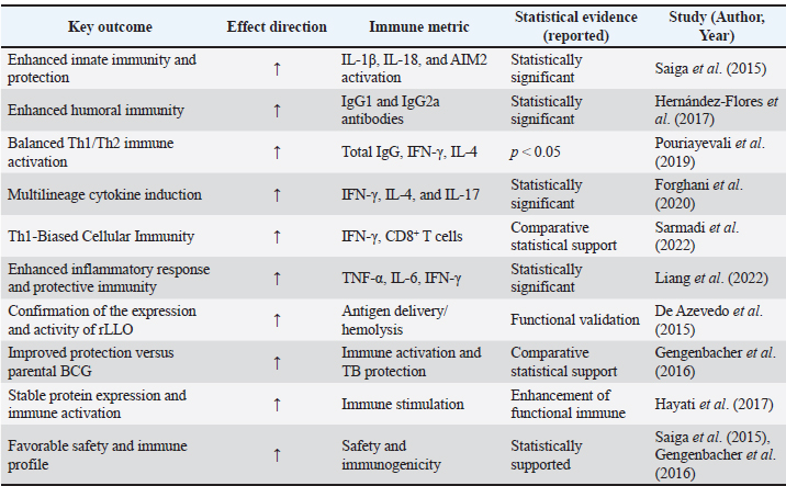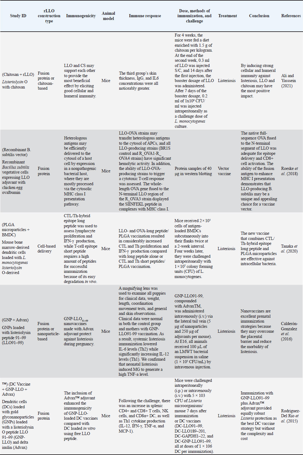 Table 6. Immunological and protective outcomes of rLLO-based experimental vaccine studies.
