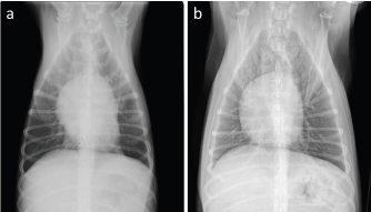 Fig. 3. Thoracic radiographs of the case. On comparing with that (a): before first doxorubicin administration, (b): generalized cardiomegaly was observed at 1 week after the administration of six cycles of epirubicin.