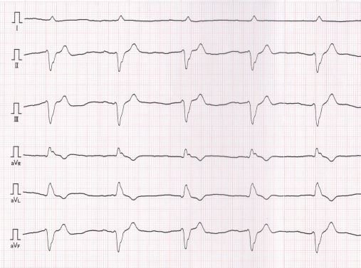 Fig. 4. Six-lead electrocardiogram, which was obtained when cardiomyopathy was found, showing accelerated idioventricular rhythm with a wide QRS complex, heart rate of 94 beats/minutes, and cardiac axis of −76° (50 mm/seconds; 1 cm=1 mV). DiscussionAnthracyclines, such as doxorubicin and epirubicin, are highly effective and frequently used antineoplastic drugs prescribed for a variety of malignancies, especially lymphoma (Elliott et al., 2013; Curran and Thamm, 2016). However, these drugs may have side effects such as myelotoxicity, nausea, vomiting, alopecia, and tissue necrosis in cases of extravasation, and the most serious chronic effects of anthracyclines are dose-dependent and irreversible cardiotoxicity. The mechanisms associated with anthracycline-induced cardiotoxicity involve inflammation, oxidative stress, apoptosis, mitochondrial impairment, and dysregulation of autophagy, which have not been fully understood (Prathumsap et al., 2020). Anthracycline-induced cardiotoxicity is characterized by cardiomyopathy, ventricular dysfunction, pericarditis-myocarditis syndrome, or arrhythmias. Regarding doxorubicin, chronic cardiotoxicity is most commonly seen with doses that exceed 180 mg/m2 or more than siz doses in dogs, but cardiotoxicity can occur with any cumulative dose (Mauldin et al., 1992; Willcox et al., 2020). Epirubicin, a stereoisomer of doxorubicin, has been reported to be less cardiotoxic than doxorubicin without compromising anti-tumor efficacy (Smith et al., 2010). Relative to doxorubicin, the equivalence ratio for epirubicin was 0.7 (McGowan et al., 2017). It is now being used instead of doxorubicin to reduce cardiotoxicity; however, the toxicity of epirubicin has not been fully evaluated in veterinary medicine, and the absolute maximum cumulative dose of epirubicin in dogs has not been defined (Kim et al., 2007; Marrington et al., 2012; Elliott et al., 2013). It has been reported that AICM occurs in dogs receiving epirubicin and doxorubicin (Lee et al., 2015). The report suggested that previous anthracycline therapy could increase the risk of cardiotoxicity. In this report, the dog was treated with cumulative epirubicin doses of 125 mg/m2, with previously administered six cycles of doxorubicin. Mitoxantrone, a synthetic anthracenedione, was developed as a doxorubicin analogue in a program to find a cytotoxic agent with decreased cardiotoxicity compared with doxorubicin (Alderton et al., 1992). In fact, past studies using dog models revealed that mitoxantrone was less cardiotoxic than doxorubicin, and mitoxantrone did not show cardiotoxicity in dogs that were pretreated with a threshold cardiotoxic dose of doxorubicin (Henderson et al., 1982; Sparano et al., 1982; Tham et al., 1987). However, a recent large human cohort study reported that mitoxantrone is cardiotoxic and four to five times more toxic than doxorubicin (Feijen et al., 2019). Further studies are required to clarify the additive or synergistic interactions of anthracyclines and other cardiotoxic drugs in dogs. In human medicine, therapeutic strategies for anthracycline-induced heart failure are not well studied. Angiotensin converting enzyme inhibitor (ACEI), diuretics, and β-blockers are used, but once symptomatic, anthracycline-induced cardiotoxicity is associated with markedly decreased survival (Cai et al., 2019). In addition, a recent study showed that administration of ACEI or a combination of beta-blockers at the early detection of anthracycline-induced cardiac insufficiency restored LVEF and reduced cardiac events (Mehta et al., 2018). However, poor tolerance to beta-blockade initiation in a human AICM patient has been reported (Tabet et al., 2006). In this study, the dog was treated with ACEI and a positive inotropic agent, following which the dog became clinically stable and echocardiographic improvement was observed. However, it was difficult to evaluate the efficacy of these drugs because the patient had a relapse of lymphoma and died shortly after the diagnosis of cardiomyopathy. There are four main strategies to protect against cardiotoxicity induced by anthracyclines: decreasing lifetime cumulative dose, prolonged intravenous infusion, liposomal formulation, and the addition of dexrazoxane (Graffagnino et al., 2020). Liposomal encapsulated doxorubicin and dexrazoxane administration has been reported in a few veterinary studies, but the long-term cardioprotective effects of these strategies have not been evaluated (FitzPatrick et al., 2010; Teske et al., 2011). Furthermore, these strategies are not widely used in veterinary medicine because of the short life span of dogs and the high costs incurred. In humans, LVEF is a recommended method used to evaluate the systolic function in patients treated with anthracycline drugs (Cai et al., 2019). Cancer therapeutics-related cardiac dysfunction is defined as a decrease in the LVEF by >10% points to a value below the lower limit of normal (usually LVEF ≥50%) (Zamorano et al., 2016). However, although LVFS is a recommended method for evaluating dogs receiving doxorubicin (Surachetpong et al., 2016), the diagnostic criteria for AICM of dogs have not been described, and the usefulness of LVFS in monitoring dogs treated with doxorubicin has not been evaluated well. In this case report, the diagnosis of AICM was based on echocardiography, ECG findings, and heart failure symptoms. Cardiac biomarkers, such as troponin, can be good indicators of doxorubicin-induced myocardial injury and can provide useful diagnostic information, especially when used in combination with echocardiography assessment (Octavia et al., 2012). In veterinary medicine, it was reported that dogs treated with doxorubicin had increased troponin levels, which were detected before echocardiographic value changes (Surachetpong et al., 2016). Furthermore, ECG abnormalities could occur after dogs received a low doxorubicin dosage (Mauldin et al., 1992). It is necessary to establish a m