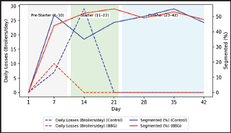 Fig. 3. Daily mortality and variations in the segmented cell percentage in broilers.