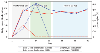 Fig. 6. Variation in the monocyte percentage and daily mortality in broilers. Table 4. Serum biochemistry parameters of broiler chickens throughout the experimental period