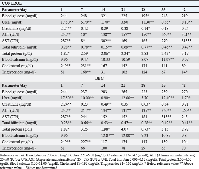 Ethical approvalInstitutional and national guidelines for the care and use of laboratory animals were followed in compliance with ethical standards, following the guidelines of the Bioethics Committee for Animal Research of the Venezuelan Institute for Scientific Research (COBIANIM 2025; May 13, 2025). ResultsAnalysis of diet and water qualityThe bromatological analysis of the diets developed for the three growth phases (pre-starter, starter, and finisher) (Table 1) confirmed that all nutritional levels were comparable between treatments. This consistency ensured that the diets were isoproteic and isoenergetic, meeting the specific nutritional requirements for each developmental stage. Table 2 shows the physical and chemical parameters of the water supplied to the broilers. Noncompliance with regulatory standards was identified for free residual chlorine, pH, and nitrate. Specifically, the absence of residual chlorine (0 mg/l) and the high nitrate concentration (34.53 mg/l NO3) indicate that the drinking water deviates considerably from the optimal values for poultry farming. Productive performanceTable 3 and Figure 1 summarize the production parameters evaluated throughout the three growth phases (Pre-starter, Starter, and Finisher) for both treatments (Control and BBG). In the pre-starter phase, the IBW was 38.64 ± 0.83 g for the Control and 39.22 ± 0.66 g for the BBG treatment, indicating no differences in the initial weight between the treatments. At the end of this phase, the FBW of the BBG treatment was higher (276.00 ± 88.50 g) compared to the Control (265.80 ± 81.57 g). The DFI was 25.11 ± 7.59 g for the Control and 40.77 ± 9.46 g for the BBG, while the BWG was 227.16 g and 236.78 g. The FCR was 0.75 and 0.40 for the control and BBG treatments, respectively. Mortality was notably higher in the control treatment (20.45%) than in the BBG treatment (9.85%), suggesting an increase in field challenge that affected both treatments, although the control showed a disproportionately greater impact. No significant differences were observed between treatments during this phase (p > 0.05). During the starter phase, the IBW was 265.80 ± 81.57 g for the Control and 276.00 ± 88.50 g for BBG, maintaining the trend of a higher FBW in the BBG treatment (1,127.20 ± 329.2 g) compared to the Control (1,092.07 ± 321.45 g). The DFI was 98.95 ± 20.33 g for the Control and 80.02 ± 25.36 g for the BBG, while the BWG was 826.27 g and 851.20 g. The FCR was 0.99 for the control and 0.84 for the BBG treatment, indicating better feed efficiency in the latter. Mortality in this phase was absent in the BBG treatment (0.00%) compared with 6.06% in the control group. Statistical analysis indicated no significant differences during this phase (p >0.05). In the finisher phase, the IBW was 1,092.07 ± 321.45 g for the Control and 1,127.20 ± 329.2 g for the BBG. At the end of the study (day 42), the FBW of the BBG treatment reached 3,078.00 ± 449.79 g, surpassing that of the control treatment, which recorded 2,743.88 ± 347.58 g. The DFI in this phase was 214.90 ± 22.77 g for the Control and 197.04 ± 14.23 g for the BBG, resulting in a BWG of 1,651.81 g and 1,950.80 g, respectively. The FCR was 1.53 for the control group and 1.59 for the BBG group. No mortality was observed in either treatment group during this phase. Statistical analysis showed no significant differences between treatments (p > 0.05). Overall, the treatment with BBG inclusion consistently showed higher FBW and BWG, as well as improved FCR during the pre-start (0.40 vs. 0.75) and starter phases (0.84 vs. 0.99), although the latter was slightly higher in the finisher phase (1.59 vs. 1.53). Notably, mortality was significantly lower in the early phase of BBG treatment, suggesting a protective effect against initial environmental challenges. Hematological profileIn the hematological analysis, the blood count results for broilers in both control and BBG treatments showed variations compared with the established reference values. Reference values: Leukocytes: 4,000–40,000 (cells/µl or mm³), Segmented cells: 20–50 (%), Lymphocytes: 45–75 (%), Eosinophils: 0–2 (%), Monocytes: 2–10 (%). In the Control treatment, leukocytes consistently exceeded the reference range at most sampling points, with peak values of 90,871 cells/μl (day 14), 59,583 cells/μl (day 21), and 45,117 cells/μl (day 42). This indicates a marked leukocytosis, suggesting chronic inflammation or an infectious process (Fig. 2). Segmented cells (heterophils) were above the reference range on days 7 (51%) and 35 (55%) (Fig. 3). Lymphocytes remained within the reference range, except on day 35 (42%) (Fig. 4). Eosinophils remained within the range throughout the study (Fig. 5), whereas monocytes were below the reference range on days 7 (1%) and 42 (1%) (Fig. 6). In the BBG treatment, leukocytes exceeded the reference range at all sampling points, with values ranging from 24,500 cells/μl (day 28) to 66,369 cells/μl (day 14) (Fig. 2). Segmented cells remained within the range, except on days 14 (52%), 21 (55%), and 35 (53%), when they were slightly above the upper limit (Fig. 3). Lymphocytes were within the reference range at all sampling points (Fig. 4), indicating a more stable immune response compared with the control. Eosinophils were within the range throughout the study (Fig. 5), whereas monocytes were below the reference range on days 21, 35, and 42 (1%) (Fig. 6). Both treatments showed markedly elevated leukocyte levels relative to the reference values throughout the study. Although segmented cell and lymphocyte trends varied, they remained mostly within or near the established ranges for both treatments. Blood biochemistryThe results of blood biochemistry analyses for broiler chickens in the control and BBG treatments are detailed in Table 4. Various alterations were observed compared with the established reference values. In the control group, blood glucose l