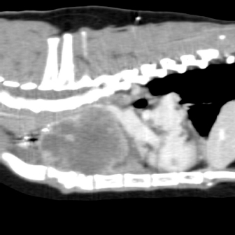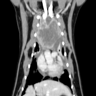 Fig. 2. Computerized tomography of the cranial mediastinal mass (coronal plane). Prior to surgery, the cat was premedicated with 1.5 mg methadone, 30 mg ketamine, and 1.5 mg midazolam intramuscularly. Anesthesia was induced with alfaxalone intravenously to effect and the cat intubated with a 4-mm cuffed endotracheal tube. Perioperative antibiotics in the form of 150 mg cephazolin were administered intravenously. Analgesia was provided by continuous rate infusion of fentanyl (5 ug/kg/hour) and ketamine (0.6 mg/kg/hour) and also received three 2 ug/kg fentanyl boluses. Anesthetic complications encountered included mild hypotension, hypothermia, and tachycardia. Intraoperatively the cat was mechanically ventilated with intermittent positive pressure ventilation. The cranial mediastinal mass was approached through a cranial median sternotomy extending caudally from the manubrium. The xiphoid was left intact. Upon entry, there was a moderate amount of serosanguinous fluid. The mass was positioned immediately cranial to the heart, incorporating the cranial vena cava, brachiocephalic trunk, and branches, including the common carotid arteries, as well as both phrenic nerves. These structures were preserved during debulking of the mass via blunt and sharp dissections, leaving approximately 10% of the tumor volume in situ around the cranial vena cava at the level of the brachiocephalic branches due to the significant risk of fatal hemorrhage with further dissection. A representative mediastinal lymph node was extirpated and was submitted for histopathological analysis alongside the cranial mediastinal mass. Hemostasis was achieved through a combination of a bipolar vessel sealing device (Caiman, Aesculap), gelatin hemostatic agent (Gelita, B. Braun), and bipolar electrocautery (Bovie, Symmetry Surgical). Prior to closure, a 10 Fr thoracic drain (Argyle, Cardinal Health) was placed through the left thoracic wall at the seventh intercostal space and secured to the skin with a Chinese finger trap suture pattern of 2–0 polypropylene. The cat recovered uneventfully from anesthesia and postoperatively it received a constant rate infusion of fentanyl (2–5 ug/kg/hour) and ketamine (0.2–0.5 mg/kg/hour), and fluid therapy in the form of Hartmann’s intravenously. The cat was initially supported in an oxygen chamber with an oxygen level starting at 60%, which was gradually reduced and successfully discontinued 14 hours later. The fentanyl and ketamine were also weaned the next day and the cat was started on buprenorphine (0.1 mg intravenously every 8 hours) for the initial 24 hours, followed by transmucosal administration for 4 days. Meloxicam (0.25 mg orally every 24 hours) for 7 days was commenced once the cat was eating well. The thoracic drain was nonproductive within 12 hours of surgery and was removed without complications. Three days postoperatively, the cat was discharged for home care.