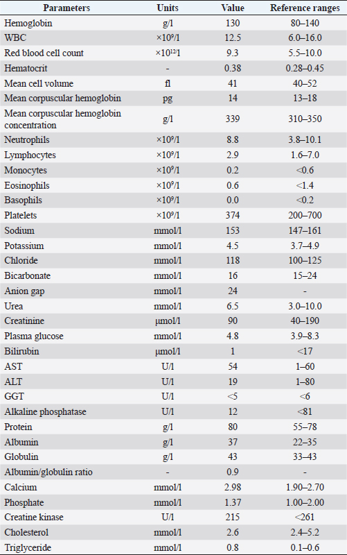 AbstractBackground: The most common cranial mediastinal masses affecting dogs and cats include lymphoma and thymic epithelial tumors. In this report, a cat with a cranial mediastinal mass was diagnosed with a thymic carcinoma subtype squamous cell carcinoma, which has rarely been reported in cats. Management of this subtype with a combination of surgery and chemotherapy has so far not been reported. This case report describes the treatment with surgical management followed by intracavitary carboplatin. Case Description: A 12-year-old male neutered domestic short hair cat was referred for lethargy, hyporexia, and weight loss, and was diagnosed with a cranial mediastinal mass radiographically. Initial cytology through fine needle aspirates was suggestive of carcinoma. Computed tomography was performed which did not show evidence of other primary tumor sources or metastases, and hence surgical resection was recommended. Intraoperative findings revealed local invasion of the surrounding tissues, including major vasculature and nerves, although histopathological assessment showed no local lymph node involvement. Intracavitary carboplatin chemotherapy was administered 2 weeks postsurgery. The patient was humanely euthanized 4 weeks postsurgery due to evidence of local recurrence causing significant respiratory compromise. Conclusion: A combination of surgical excision as well as intracavitary carboplatin does not seem to be effective for the treatment of this thymic carcinoma subtype, with evidence of early recurrence and return of clinical signs. Keywords: Thymic carcinoma, Squamous cell carcinoma, Mediastinal mass, Carboplatin. IntroductionThe most common cranial mediastinal masses affecting both dogs and cats include lymphoma and thymic epithelial tumors (TETs), with other differentials being relatively rare (Withrow, 2013). The term TETs has been used to outline a number of histologic subtypes of thymoma in humans, and has been recently been described in dogs (Burgess et al., 2016; Oura et al., 2019). TETs are currently classified according to the World Health Organization’s histopathological classification which differentiates thymomas from thymic carcinomas, with thymic carcinomas differentiated into subtypes (Marx et al., 2022). In the present case, the cat had been diagnosed with thymic carcinoma with a subtype of squamous cell carcinoma which has rarely been reported in cats (Carpenter and Valentine, 1992; Anilkumar et al., 1994). Of the only reported case where surgical intervention was pursued, persistent pleural effusion after surgical resection was a feature, which eventually led to humane euthanasia of the patient (Carpenter and Valentine, 1992). Chemotherapy has not been reported as a management for this subtype of thymic carcinoma. To our knowledge, this is the first case describing surgical management with postoperative usage of intracavitary carboplatin. Case DetailsA 12-year-old male neutered domestic short hair cat weighing 5.4 kg presented to the Small Animal Specialist Hospital (SASH, North Ryde) oncology department for further workup of a cranial mediastinal mass diagnosed radiographically by the referring veterinarian. Initial presenting complaints were recent hyporexia, lethargy, and weight loss. Complete blood count, serum biochemistry, and urinalysis were performed. Hyperproteinemia 80 g/l [reference interval (RI) 55–78 g/l], hyperalbuminemia 37 g/l (RI 22–35 g/l), hypertriglyceridemia 0.8 mmol/l (RI 0.1–0.6 mmol/l), and hypercalcemia 1.60 mmol/l (RI 1.10–1.40, ionized calcium) were noted on the blood work (Table 1). Urinalysis showed mild proteinuria and hematuria, which was considered to be clinically insignificant on a cystocentesis sample. The mass was diagnosed via three-view thoracic radiographs and sampled via fine need aspiration guided by ultrasound. Cytological findings were suggestive of carcinoma. On physical examination, the cat had an unkept coat, reduced respiratory sounds cranially, and persistent stridor, but was otherwise bright and ambulatory. Computed tomography (CT) was performed using a Phillips Brilliance six slice CT. Multiphase contrast-enhanced CT images of the head, thorax, and abdomen were acquired with the cat in sternal recumbency (Figs. 1 and 2). A cranial mediastinal mass measuring 60 × 40 mm causing dorsal tracheal displacement toward the right was identified. With contrast administration, there was moderate enhancement of the periphery (+60 Hu) and poor central enhancement (+10 Hu). There was moderate to marked compression of the cranial vena cava, with a focal intraluminal contrast-filling defect at the cranial aspect of the vena cava just caudal to the mass. Here, the path of the cranial vena cava could not be completely traced, suggesting almost complete compression or invasion. There was no evidence of subcutaneous edema of the head or cervical region. Moderate volume of pleural fluid was bilaterally present. Multifocal, slightly branching soft tissue conglomerates largely following the bronchi of the caudal lobes toward the apex was noted, most likely to be bronchial disease with bronchiolar consolidation. Pulmonary metastatic neoplasia was considered to be unlikely. Surgical resection in the form of debulking was recommended on the basis that the large cranial mediastinal mass was most likely the cause of the cat’s clinical signs, and that reduction of gross disease should improve survival time as well as being more responsive to adjunctive treatment with chemotherapy. The cat was then started on mirtazapine (1.875 mg orally every 48 hours) and prednisolone (5 mg orally every 24 hours). Table 1. Complete blood count and biochemistry.