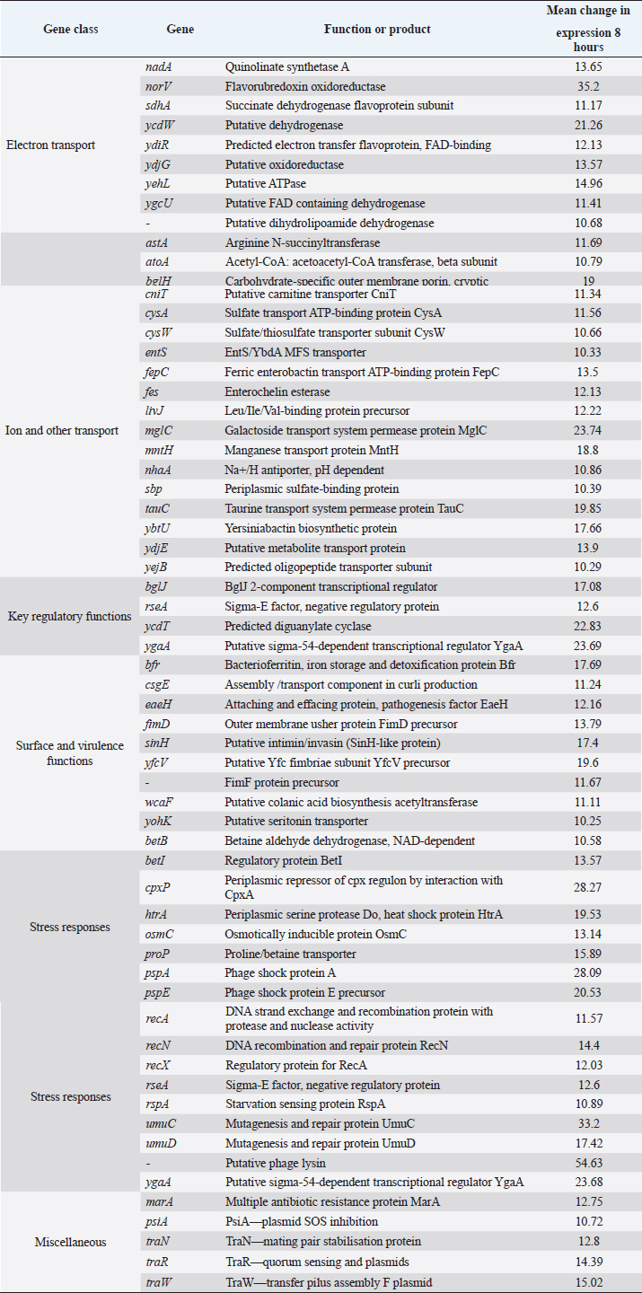 (iii) Transport. Many of the transport genes up-regulated in macrophages were associated with the uptake of carbohydrates and other potential carbon sources. These included galactoside transport permease (mglC), a C4-dicarboxylate binding protein (dcuB, mentioned above), a putative hexuronate transporter, and transport proteins for oligopeptides (yejB), and long-chain fatty acids (fadL). Up-regulation of genes encoding ion transport proteins for sulfate (cysA, cysW, sbp, tauC), manganese (mntH), and ferric iron (fepC, entS, fes, ybtU), and iron storage (bfr) indicated restriction for these ions. (iv) Stress. In comparison with growth in NB, the bacteria were subjected to higher osmotic stress as indicated by a number of genes related to the biosynthesis of betaine (betAB), its regulator (betL), proP which transports both proline and betaine and osmC. The heat stress-related proteins htrA and cpxP were up-regulated. Stresses to DNA are indicated by up-regulation of recA and its regulator recX, recN, and umuC, and umuD. This is probably also linked to increased prophage activity with a number of genes up-regulated including pspA and pspE, a prophage integrase, intD and a putative phage lysin. (v) Surface and virulence proteins. The major virulence genes up-regulated were associated with fimbriae elaboration (csgE, fimD, fimF, and yfcV) and adhesins/invasins (eaeH and sinH). One of the colanic acid biosynthesis genes wcaF was up-regulated. These changes were accompanied by down-regulation of genes associated with sialic acid capsule formation. Genes encoding surface porins OmpF, NmpC, and the OmpN precursor were also down-regulated. Confirmation of levels of gene expression by qRT-PCR was not carried out. Although there are some limitations in the range of signal intensity obtainable with microarrays, most publications show very good correlation between levels of expression measured by microarray and by qRT-PCR or other quantitative methods, including E. coli in vitro (Richmond et al., 1999), Enterohaemorrhagic E. coli in contact with rabbit cells (Dahan et al., 2004), S. typhimurium in murine macrophages (Eriksson et al., 2003), in human and canine epithelial cells (Hautefort et al., 2008), the chicken intestine (Dhawi et al., 2011; Harvey e t a l., 2011) and with four different Salmonella enterica serovars in HD11 cells (Imre et al., 2013). Synthetic medium and vaccine developmentThe microarray results showed changes in gene expression indicative of availability of gluconate, succinate, and cysteine with Fe and Mn restriction and osmotic and heat stress, although the preferred carbon source was unclear. This information combined with published literature, indicating low phagosome pH, (Rathman et al., 1996), was used to develop a synthetic medium (SMM-1), the full composition which is described in Materials and Methods. This was used to generate a bacterin of E. coli F31 for vaccination studies. Vaccination experimentThe protective effects of the F31 bacterin produced by culture in medium SMM-1 against intravenous challenge of an O78:K80 strain F135 compared to those induced by a bacterin prepared using the same strain cultured in NB are shown in Table 3. Table 2. Changes in gene expression in E. coli F31 cultured in HD11 cells measured by microarray which were down-regulated by greater than 10-fold after 8 hours culture in HD11 cells.