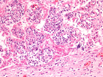 Fig. 1. Histological section of the placenta. Placental villi are congested and multifocally necrotic with neutrophilic infiltration. Foci of hemorrhages are present in the submucosa. (H&E, 100×). An antimicrobial susceptibility test was carried out by disk diffusion on cation-adjusted Mueller Hinton Broth (CAMHA). Briefly, after colony growth and identification, a bacterial suspension was prepared and adjusted to McFarland 0.5 and it was swabbed onto CAMHA. Antibiotic disks were dispensed to the agar surface and the plate was incubated at 37°C for 18–20 hours. The bacterium was susceptible in vitro to amikacin, gentamicin, cefazolin, enrofloxacin, marbofloxacin, and trimethoprim/sulfamethoxazole and intermediate to ampicillin and ceftiofur. Once antimicrobial susceptibility results became available, the horses were first treated with gentamicin at a dosage of 6.6 mg/kg PO q24h and then, circa 45 days later, with an autogenous vaccine, custom-made at Istituto Zooprofilattico Sperimentale dell’Umbria e delle Marche “Togo Rosati” (IZSUM). The institute was authorized by the Italian Ministry of Health by legislative decree (17th March 1994, n. 287) to produce emergency medical tools. Following the standard production process, an autogenous vaccine was produced and adjuvanted with aluminum hydroxide. All culture media for the vaccine production were made at the pharmaceutical unit, Culture Media Laboratory. Briefly, the bacterial strain isolated in the stable was submitted for vaccine batch production after serotyping and characterization. The production process started with the culture of the characterized strain: one, isolated and pure colony of Salmonella abortus equi was spread by sliding on a tryptic soy agar (TSA) and incubated in a humid chamber for 24 hours at 37°C. After incubation and purity control by Gram staining, a TSA block containing a pure colony was transferred into a Tryptone soy broth (TSB) flask and left to incubate for further 24 hours at 37°C under agitation. After a second purity check, fresh TSB medium in the ratio 1/10 (v/v) was added to the obtained matrix, for the amplification of the strain. Once the requested vaccine batch volume was reached, a third purity control was carried out before the chemical inactivation and concentration step. Briefly, a formaldehyde solution 0.05% (v/v) was added to the amplified matrix; subsequently, it was scalarly diluted (10-fold) in three tubes containing TSB and incubated at 37°C for 48 hours, then adjusted to a final concentration of 1.5 × 109 CFU/ml based on the McFarland scale. The inactivated culture was then adjuvanted with aluminum hydroxide (20% v/v). The filled vaccine was checked for neutral pH (6.8–7.4) and safety in five BalbC mice (in vivo residual pathogenicity test) by administering subcutaneously a dose 10 times higher (0.5 ml) than that usually adopted, as stated in the legislative decree (17th March 1994, n. 287, Chapter III). Animals were housed in the animal facility of IZSUM and all welfare and care practices were applied according to the Italian legislative decree n. 26 of 4th March 2014, application of 2010/63/UE Directive (2010/63/UE Directive on the protection of animals used for scientific purposes). Mice were monitored for 72 hours after the injection; particularly, abnormal/local reactions, temperature rising, and global wellness were carefully evaluated by the designed veterinarian and personnel. For the sterility requirement testing before release, an aliquot from the batch was delivered to the microbiology unit. The sample was inoculated in selective media for aerobes, anaerobes, and fungi for 15 days at different temperatures, as described in the X edition of European Pharmacopeia (European Pharmacopeia, 2019). After confirmation of vaccine sterility and safety, the aluminum hydroxide-adjuvanted formulation was administered subcutaneously (5 ml) in the neck region to pregnant mares and to those that had an abortion. After 72 hours from the administration of the vaccine adjuvanted with aluminum hydroxide, a transient local tumefaction and neck stiffness were observed in mares. Additionally, the animals developed fever (39°C) and lack of appetite for 2 days. A small granuloma had persisted until this time. Therefore, for the alternative inoculation and the subsequent booster dose, it was decided to produce a new vaccine batch by performing the above-described procedure using 20% v/v of Montanide™ Seppic IMS1313, a ready to dilute adjuvant consisting of liquid particles (10–500 nm) dispersed in an aqueous phase containing an immunostimulating compound. The in vivo residual pathogenicity test was carried out in five mice, as detailed above. Twenty-one days after the immunization with the vaccine adjuvanted with aluminum hydroxide, 5 ml dose of the Montanide™-adjuvanted vaccine was initially inoculated to one mare for a safety test. Only after 72 hours, when the absence of any kind of immediate or delayed systemic and/or locally reactions was verified, it was administered to eight remaining mares. Moreover, a recall dose after 6 months was administrated to all mares housed in the stall—still pregnant and not pregnant. The vaccine adjuvanted with Montanide™ Seppic IMS1313 did not cause any local response and/or adverse reaction after the first and second administration. One week after the recall vaccination with Montanide™ Seppic IMS1313, the five mares treated during pregnancy and their foals were tested for Salmonella serological test at a private laboratory. All animals showed high titers (>1:320; cutoff sample/positive >1:40). After 1 year from the last immunization treatment, abortion cases were not observed. Figure 2 shows all the phases described above. DiscussionGenerally, salmonellosis occurs as an asymptomatic infection in horses, and infected animals play an important epidemiological role in disease transmission. When these carriers become stressed, they can show d
