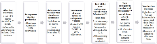 Fig. 2. Schematic representation of the outbreak management. The aluminum hydroxide used for the production of the first vaccine batch is a classical adjuvant, which allows the antigen to be “retained” at the injection point to recall the immune system cells. Even if the inoculation of aluminum hydroxide-based adjuvant vaccine is well known and safe, it can cause local adverse reactions, such as erythema, subcutaneous nodules, contact hypersensitivity, and granuloma (He et al., 2015). In some cases, vaccines containing aluminum salts (characterized by acid pH) can cause pain, redness, and swelling at the injection site, which generally resolve on its own after a few hours without compromising the vaccine efficacy and without severe adverse outcome. In this case, the appearance of transient local swelling, with neck stiffness and fever, suggested the inadequacy of alum hydroxide adjuvant for the equine species and the need of finding less aggressive but still effective new generation adjuvant replacement to be used. Intended for the described outbreak caused by Salmonella abortus equi, a new vaccine batch was produced. We adjuvanted the bacterial culture with Montanide™ Seppic IMS1313, a combination of microemulsions and an immunostimulating compound. Since this adjuvant is composed of an aqueous phase, it is suitable as a mucosal delivery vehicle. Montanide™ Seppic IMS1313 was tested in different formulation vaccines for different animal species and there was absence of any severe injection site reactions (Dhakal and Renukaradhya, 2019). It is also eligible for oral delivery mass vaccination too (Riffault et al., 2010). Moreover, in vivo experimental infections demonstrated the ability of Montanide™ Seppic IMS1313 to enhance immune protection in different animal species (Jang et al., 2011). Here, we observed that Montanide™ Seppic IMS1313 adjuvant at 20% v/v was able to minimize possible adverse effects in horses. Particularly, after the second immunization dose, no animal showed clinical adverse effects and the infection was successfully controlled. Remarkably, serological data collected after the second immunization suggested a high humoral protection elicited in mares and a huge passive immunity conferred to newborn foals. Vaccination is also useful to prevent the massive antibiotic use. As a result, it can have a major role in fighting antimicrobial resistance. In conclusion, we support the use of the Montanide™ Seppic IMS1313-adjuvanted vaccine as a safe, well-tolerated, and highly immunogenic tool for preventing Salmonella abortus equi abortion. Despite the combined protocol effect on resolution of the infection in the stall and its 1-year lasting protection, we can consider to adopt other modifications to the vaccination protocol in other possible future outbreaks. An autogenous vaccine is a flexible tool and it can be customized depending on the epidemiological scenario and overall with the aim to minimize animal stress, particularly in pregnant mares, or avoid possible adverse reactions. To the best of authors’ knowledge, this is the first reported case of immunization intervention in horses with an autogenous vaccine adjuvanted with Montanide™ Seppic IMS1313 against Salmonella abortus equi. Conflict of interestThe authors declare no potential conflicts of interest for the research, authorship, and/or publication of this article. Authors’ contributionsSM, PM, and DPA: Conceptualization; DPA, RE, SM, and PF: Data curation; RE, SM, PF, PM, SM; SM, RE, SM, and PF: Formal analysis; RE, SM, PF, and PM: Investigation; SM, SG, and PF: Supervision; SM, PM, DPA, RE, SM, PF, and SG: Writing, review, and editing. FundingThe authors received no financial support for the research, authorship, and/or publication of this article. ReferencesBustos, C.P., Gallardo Retamar, G., Lanza, N.S., Falzoni, E, Caffer, M.I., Picos, J., Munos, A.J., Perez, A., Moras, E.V., Mesplet, M. and Guida, N. 2016. Salmonella enterica serovar abortus equi as an emergent pathogen causing equine abortion in Argentine. J. Equine Vet. Sci. 39(Suppl), S58–S59. Chandra, M. and Kaur, G. 2018. An update on Equine Salmonellosis. E.C. Vet. Sci. 3, 348-353. DECRETO LEGISLATIVO 4 marzo 2014, n. 26. Attuazione della direttiva 2010/63/UE sulla protezione degli animali utilizzati a fini scientifici. Dhakal, S. and Renukaradhya, G.J. 2019. Nanoparticle-based vaccine development and evaluation against viral infections in pigs. Vet. Res. 50, 90. EU Directive 2010/63/EU of the European Parliament “on the protection of animals used for scientific purposes” and is one of the most stringent ethical and welfare standards worldwide. 2010. 102(1), 83–86. European Pharmacopoeia. 2019. Test for sterility, 10th ed., Chapter 2.6.1. Published by European Directorate for the Quality of Medicines & HealthCare, Council of Europe, Avenue de l’Europe F-67075 Strasbourg Cedex, France. Grandolfo, E., Parisi, A., Ricci, A., Lorusso, E., de Siena, R., Trotta, A., Buonavoglia, D., Martella, V. and Corrente, M. 2018. High mortality in foals associated with Salmonella enterica subsp. enterica abortus equi infection in Italy. J. Vet. Diagn. Invest. 30(3), 483–485. He, P., Zou, Y. and Hu, Z. 2015. Advances in aluminum hydroxide-based adjuvant research and its mechanism. Human Vac. Immunother. 11(2), 477–488. Jajere, S.M. 2019. A review of Salmonella enterica with particular focus on the pathogenicity and virulence factors, host specificity and antimicrobial resistance including multidrug resistance. Vet. World 12(4), 504–521. Jang, S.I., Lillehoj, H.S., Lee, S.H., Lee, K.W., Lillehoj, E.P., Bertrand, F., Dupuis, L. and Deville, S. 2011. Montanide IMS 1313 N VG PR nanoparticle adjuvant enhances antigen-specific immune responses to profilin following mucosal vaccination against Eimeria acervulina. Vet. Parasitol. 182(2–4), 163–170. Llorente, L., Ivanissevich, A., Camiña, S., Marco, L., Vissani, A., Olguin, P.C., Herrera, 