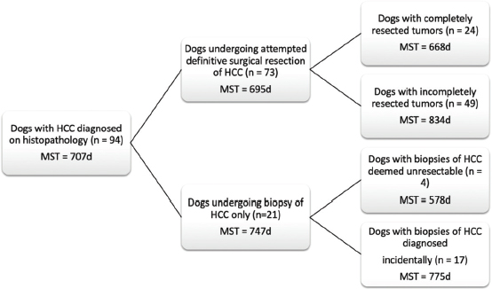 Fig. 1. Schematic demonstrating the MST of dogs following a histopathologic diagnosis of HCC. There was no significant difference in MST between those dogs undergoing definitive surgical resection and those undergoing biopsy. For those dogs undergoing definitive surgical resection, there was no significant difference in MST between those that had complete and incomplete surgical margins. Likewise, there was no significant difference in MST between dogs that had biopsies of HCC that was deemed unresectable at surgery, and those that had HCC diagnosed incidentally.