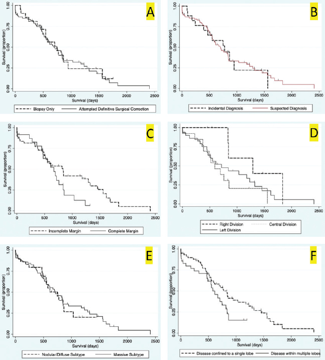 Fig. 3. Kaplan–Meier survival curves for long-term outcome: (A) Kaplan–Meier survival curve demonstrating no significant difference in survival between the group that had definitive surgical resection and those that had only had a biopsy carried out (HR=1.07, CI=0.60–1.91, p=0.810). (B) Kaplan–Meier survival curve demonstrating that there was no significant difference in survival between those dogs incidentally diagnosed via a surgical biopsy during abdominal exploratory surgery for another disease process and dogs with presumptive preoperative diagnosis of HCC [dogs with attempted surgical resection of a liver mass (n=73) or biopsy of a mass that was deemed unresectable (n=4)] (HR=0.98, CI=0.52–1.84, p=0.943). (C) Kaplan–Meier survival curve of dogs undergoing attempted definitive surgical resection of HCC. There was no significant difference in survival between dogs that had complete versus incomplete surgical margins (HR=1.63, CI=0.89–2.98, p=0.111). (D) Kaplan–Meier survival curve of dogs with HCC confined to a single liver lobe undergoing attempted definitive surgical resection. No significant difference in survival was identified between dogs with tumors in the right, central or left division. Right versus central (HR=2.98, CI=0.92–9.63, p=0.068), right versus left (HR=2.09, CI=0.72–6.11, p=0.177), and central versus left (HR=0.70, CI=0.33–1.47, p=0.349). (E) Kaplan–Meier survival curve demonstrating no significant difference in survival in dogs with massive subtype and those without a massive subtype (diffuse or nodular) (HR=0.92, CI=0.53–1.61, p=0.773). (F) Kaplan–Meier survival curve demonstrating no significant difference in survival in dogs with HCC confined to a single liver lobe and those with HCC affecting multiple lobes (HR=1.65, CI=0.96–2.83, p=0.070). Table 1. Variables associated with overall survival in all 94 patients with a histopathologic diagnosis of HCC following multivariable Cox regression analysis.