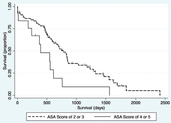 Fig. 4. Kaplan–Meier survival curve demonstrating that dogs with an ASA score of 4 or 5 prior to surgery had a significant association with a decreased survival in all patients (n=94) in the final multivariable model (HR=2.94, CI=1.43–6.01, p=0.003).