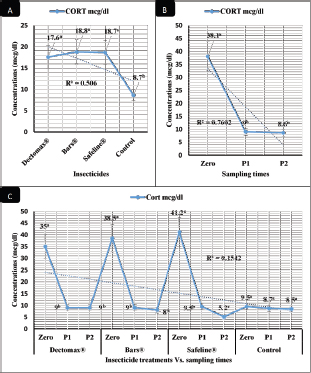 Fig. 5. CORT stress marker (mean ± SE) of infested dogs treated with different experimented insecticides. (A) CORT overall means concerning experimental groups. (B) CORT overall means concerning sampling times. (C) CORT overall means concerning experimental groups by time interactions. The in-vivo results reveal significant improvements of hematological profile (RBCs, HCT, MCHC, PLT, and total and differential leukocytic counts), ESR in the second hour, biochemical profile (TP, CREAT, ALT, UREA, GLUCO, TG, and TC), and CORT levels of the 2-week (P1) and 4-week posttreatment (P2) samples in the infested dogs, considering that the evaluation was carried out for a month after the treatments. These results are in agreement with those of El-Naggar et al. (2017) who reported no adverse effects of the experimented bio-insecticides on the histopathological and physiological functions of liver, kidney, and cerebellum in male Albino mice. Marchiondo et al. (2013, 2019) also reported the necessity to assess the long-term effectiveness of the tested insecticide with intervals of 7–31 days. Segev et al. (2018) also advocate spot-on and injectable doramectin protocols as effective in treating 10 dogs from infestation with some internal and external parasites. Benelli et al. (2017b) recorded that doramectin was efficient and able to enforce good residual action for 63 days during which no external parasitism was noticed on animals. Wanji et al. (2017) reported a significant reduction in microfilaria count and improvement in hematological and biochemical parameters following treatment of external parasitic infestations using ivermectin. Benelli et al. (2016) reported the ability of some chemical insecticides as doramectin to treat animals infested with ticks with significant improvement of the hematological and biochemical profiles of the animals. Benelli et al. (2017a) and Nicoletti et al. (2016) experimented with neem, and Pavela and Benelli (2016) experimented with essential oils as a herbal eco-friendly insecticide related to the phenylpyrazole–garlic–camphor mix (Safeline®) used in our study and they found its actions to be superior to the ideal insecticides in eradication programs of tick infestations. The maintained levels of ALT posttreatment in the current experiment excluded any sign of the development of stress conditions in line with Ahmed et al. (2020) and Khalil and Samrah (2018) who recorded the possible prophylactic effect of insecticides like ivermectin when used in a single dose. They also recommended the use of some herbal eco-friendly alternatives to avoid the alterations in the physiological functions that might occur after treatment. ConclusionThe study revealed the significant in-vitro efficacy of chemicals like Doramectin (Dectomax®) and Fipronil 50 mg/ml (Bars®), and herbal eco-friendly insecticides like the phenylpyrazole–garlic–camphor mix (Safeline®) against R. sanguineus with 100% killing efficacy that was achieved after 8 hours in both Doramectin (Dectomax®) and Fipronil 50 mg/ml (Bars®) and 24 hours in phenylpyrazole–garlic–camphor mix (Safeline®). The insecticidal treatments for infested dogs achieved significant improvements in hematological parameters like RBCs, HCT, MCHC, total and differential leukocytic counts, and ESR, as well biochemical and hormonal profiles, like TP, CREAT, ALT, UREA, GLUCO, TG, TC, and CORT levels in the 2-week (P1) and 4-week posttreatment (P2) samples in Doramectin (Dectomax®), Fipronil 50 mg/ml (Bars®), and phenylpyrazole–garlic–camphor mix (Safeline®)-treated dogs with more pronounced recovery in phenylpyrazole–garlic–camphor mix (Safeline®)-treated dogs. Herbal insecticides like phenylpyrazole–garlic–camphor mix (Safeline®) that are based on camphor oil and garlic and according to the current results might be recommended with a higher incidence for prophylaxis and treatment against external parasites’ infestations for their natural contents that provide extended actions, safe use, lower impact on the environment, effective actions, and lower toxicity to the animals compared to the chemical insecticides like Doramectin (Dectomax®, Macrocyclic lactones) and Fipronil 50 mg/ml (Bars®, a mix of Fipronil, diflubenzuron, and dicarboximide). AcknowledgmentThe authors sincerely and honorably thank Prof. MA Sobieh for his guidance and help in summarizing the work design. The current study received no grant from any funding agency in the public and commercial fields and not-for-profit sectors. The authors funded the study. Conflict of interestThe authors declare that they have no financial or personal conflicts which may have inappropriately influenced them in writing this manuscript. Authors’ contributionsESS designed the in-vitro and in-vivo experimental designs, executed the experiment, conducted biochemical analysis, and took a part in writing the manuscript. EMA participated in conducting the in-vivo experiment, conducted hematological analysis, and took a part in writing the manuscript. EMA supervised the tick collection used for both in-vitro and in-vivo experiments, induced the experimental infestation of dogs, and took a part in writing the manuscript. MAS directed the team and group work, supervised the experiments, and took a part in writing the manuscript. ReferencesAbbassy, M.A., Marei, A.E.S.M., Al-Ashkar, M.A.M. and Mossa, A.T.H. 2014. Adverse biochemical effects of various pesticides on sprayers of cotton fields in El-Behira Governorate, Egypt. Biomed. Aging Pathol. 4(3), 251–256. Abd-Ella, A.A. 2013. Toxicity and persistence of selected neonicotinoide insecticides on cowpea aphid, Aphis craccivora Koch (Homoptera: Aphididae). Arch. Phytopathol. Plant Prot. 47(3), 366–376. Abd-Ella, A.A. 2016. Evaluation of certain neonicotinoid insecticide seed treatments against cereal aphids on some wheat cultivars. J. Phytopathol. Pest Manag. 3(1), 21–33. Aguilar, G., Olvera, A.M., Carvajal, B.I. a