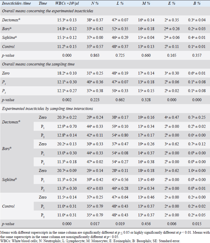 Doramectin (Dectomax®) is a semisynthetic avermectin, and when administered repetitively, it can diffuse to tissues and contribute to mild toxicity, hepatic toxicity, renal toxicity, and central nervous system depression (Zhang et al., 2016). Usually, it can be deposited in adipose tissue, interfere with hepatocellular activity causing lipid peroxidation and degradation, and suppress the glutathione enzymatic system activity, contributing to the suppression of proliferating cell nuclear antigen (Venkateswarlu et al., 2017). That is why the use of such synthetic insecticides should not be repeated without cause. Care also should be given to the dose and concentration used, whether it is used for prophylaxis or treatment. Doramectin (Dectomax®) is usually recommended in monthly doses for prophylaxis and one dose for treatment as reported by Foy et al. (2019). It is also recommended to use avermectins by injection route to avoid stomach upset and vomiting (Barrett et al., 2016). The in-vivo-tested insecticides were applied as recommended by the manufacturer to the infested dogs using different means of applications: injection in Doramectin (Dectomax®), pour-on in Fipronil 50 mg/ml (Bars®), and spraying in phenylpyrazole–garlic–camphor mix (Safeline®). Despite the differences in applications between the tested insecticides, they were able to act efficiently and maintain the physiological functions of the treated dogs instead of causing physiological alterations and disturbances. The problem with using the insecticides, in general, was their low impacts on the environmental components (Al-Awthan et al., 2012). Abbassy et al. (2014) and Ali et al. (2017) stated that many synthetic insecticides such as Doramectin (Dectomax®) and pour-on in Fipronil 50 mg/ml (Bars®) contributed to extensive influences and accumulation in some environmental components, as well biochemical and hormonal alterations in animals (Nasr et al., 2016). That is why the synthetic insecticides were recommended to be used once as in the current experiment despite infestation. Desai et al. (2016) recommended that prophylactic applications are not recommended by using chemical and organic insecticides. On the other hand, Mossa et al. (2017) reported that natural insecticides such as phenylpyrazole–garlic–camphor mix (Safeline®) in the current study are much recommended for animal treatment for maintaining animal physiological functions and their low impact on the environmental components.