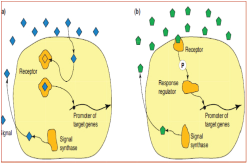 Fig. 2. Mechanism of quorum sensing antagonism (Defoirdt et al., 2011). Improving water quality (Bioremediation)The addition of Gram-positive bacteria, such as Bacillus spp., is beneficial in improving the water quality with the conversion of organic matter into carbon dioxide in comparison to the Gram-negative bacteria, which convert a greater amount of organic matter into bacterial biomass or slime (Balcazar et al., 2006). Additionally, ammonia and nitrite toxicity can be eliminated by the application of nitrifying bacterial cultures into the fish aquaria; moreover, the temperature, pH, dissolved oxygen, NH3, and H2S in rearing water were found to be in permissible limits when probiotics were added. The improvement of water quality or the environment of fish was taking the expression of “bioremediation” (Mohapatra et al., 2012). PrebioticsThese are non-digestible food constituents represented by mannan-oligosaccharides (MOS) which originated from cell wall components of yeast. It stimulates the intestinal health-promoting bacteria including lactobacillus and so limiting the occurrence of pathogenic bacteria in fish farms (Sohn et al., 2000). Additionally, Rodrigues-Estrada et al. (2008) stated that dietary supplementation with MOS stimulated growth, hemolytic activity, and phagocytic activity improving fish survival in a challenge study with V. anguillarum. Moreover, rainbow trout (Oncorhynchus mykiss) fed with the MOS diet had significantly improved growth performance, antibody titer, and lysozyme activity (Staykov et al., 2007). SynbioticIt is a combination of both prebiotics and probiotics that indicated to improve the survival and propagation of the live microbiota in the gastrointestinal tract. An individual administration of the dietary Enterococcus faecalis or MOS in salmonid fish provided a wide range of benefits regarding the immune response and survival in a challenge study with V. anguillarum. However, it was clear that synbiotic feeding (E. faecalis + MOS) yielded significantly improved results than either individual probiotic or prebiotic application (Gatlin and Peredo, 2012). Bio vaccinesLiving attenuated vaccinesThis type of vaccine is not inactivated but it can be made by decreasing its virulence genetically and so, giving live vaccine induces an immune response in the host for a short period of time (Adams et al., 2008). This vaccine has great importance in aquaculture. The application of attenuated or modified live bacterial vaccine in aquaculture was started in 1990 (Sun et al., 2010). Attenuated vaccines for fish need to apply strict examination before licensing. Vaccination using an attenuated vaccine is an imitation model of infection. It significantly stimulates the cellular immune response. Also, they are capable of stimulating humoral and mucosal immunity (Clark and Cassidy-Hanley, 2005). Encapsulated oral vaccineLive feeds bio-encapsulated vaccineThe encapsulation needs to be applied either to prevent the escaping of antigens from the pellets or to protect it from the acidic environment in the fish stomach. Bio-encapsulated feed is particularly suitable for fish fry and by which live feeds such as Artemia, copepods, and rotifers are incorporated with the vaccine suspension and fed to fish (Lin et al., 2005). The bio-encapsulated feed then releases the vaccine into the digestive tract of the fish, which appears to be the most attractive method for releasing of vaccines. It reduces the handling of fish and consequently reduces the fish stress. It is also being suitable for mass immunization. For effective oral vaccine delivery, the antigen should not be subject to digestive hydrolysis and should be absorbed well for inducing a protective immune response (Vandenberg, 2004). Nano-bio-encapsulated vaccineRecent research studies have paid attention to the use of nanoparticles (NPs) as adjuvant and efficient delivery systems in fish vaccine development due to their nano size. These NPs can be grasped by cellular endocytosis mechanism which facilitates the cellular uptake of antigens and increases its presentation ability (Vinay et al., 2018). Bacteriophages therapyAnother highly significant biological control method for pathogenic bacteria in aquaculture is the use of bacteriophages which are harmless for humans and animals and can be applied safely as therapeutic means. Phages have been used in several areas of biotechnology and medical sciences, including prevention of bacterial disease, treatment, rapid detection of disease, and biological control (Haq et al., 2012). Moreover, bacteriophages are highly specific and can only infect bacterial cells that have cell surface receptors matching those of the phage (similar to a key and lock mechanism) (Kutter and Sulakvelidze, 2004). Also, bacteriophages used for biological control of pathogens in cultured fish have gained much interest, as no drug residues are associated with such treatment (Jun et al., 2016; Silva et al., 2016). Furthermore, the use of phage for therapeutic purpose in aquaculture has potential to control diseases depending on the isolation and identification of phage, which will specifically kill the pathogens (Higuera et al., 2013). Phage therapy dosageDetermining the proper dosage of phages is very important for effective phage therapy. A varying dosage has been reported by several studies both experimentally and in field conditions, and the phage treatment may not be cost effective if the concentration of phage required is very high. It should be focused mainly on isolating and characterizing those phages which have a high infecting ability at lower doses as well as high replication rate (Rong et al., 2014). Modes of application of phages in aquacultureSeveral modes of application for phages as therapeutic and prophylactic agents to control bacterial diseases in aquaculture have been reported, which include oral administration through the feed, intramuscular or intraperitoneal administration, ana