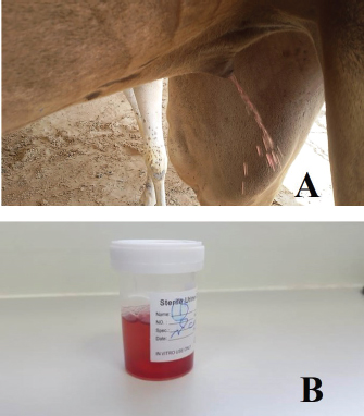 Fig. 1. (A) Clinically infected dromedary camel excreting red urine. (B) Red urine sample collected from the animal.