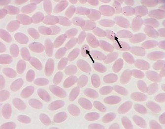 Fig. 2. Blood film from infected dromedary camel shows intraerythrocytic pleomorphic Theileria piroplasms (arrows) (Giemsa stain, 100×).