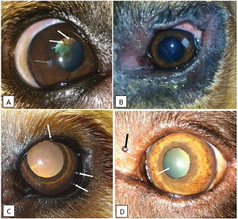Fig. 1. Photographs of some of the ophthalmic abnormalities found in working dogs. A: Pupillary persistent membrane (white arrow) and corneal opacity (black arrow) in a 4-year-old male Belgian Malinois. B: blepharitis in a 1-year-old female Bloodhound. C: distichiasis (white arrows) in a 1-year-old female Golden Retriever. D: pigmented palpebral nodule (black arrow) and nuclear sclerosis (white arrow) in an 8-year-old female Labrador Retriever.