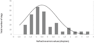 ResultsHistory and classification of service tasksOf the 71 dogs examined, there were more males (n=42, median 2 ± 2.52 years old, range: 2 months–9 years) than females (n=29, median 1 ± 1.52 years old, range: 4 months–10 years). All the age values are presented as median and interquartile range in years. There were a total of 10 guide dogs and 61 police dogs, of which they were separated into 24 sniffers dogs, 10 tracking dogs, 17 attack and protection dogs, and 10 dogs in training or other functions. The details are presented in Table 1. All the dogs were submitted to a rigorous vaccination and deworming programs since their selection was puppies. Altogether, handlers, trainers, and owners said that all the dogs perform their tasks efficiently and they have no perceived evidence of visual impairment. Ophthalmic abnormalitiesIn all, 38 (54%) of the 71 dogs had some ophthalmic abnormality detected, comprising 47 identified abnormalities. The affected dogs were 4 ± 2.5 years of age, when compared to 1 ± 0.17 years for dogs without abnormalities. The age difference was statistically significant (p < 0.05) between the affected and non-affected dogs. There was no significant difference in gender (p > 0.05). The most prevalent ophthalmic abnormality was incipient cataracts, affecting 15 (21%) dogs (5 ± 1.5 years). Twelve cataracts were incipient, occupying less than 5% of the lens diameter, and were out of the visual axis, and three were within the visual axis (two within the lens nucleus and one on the anterior lens capsule). The affected breeds were Belgian Malinois (5), Labrador retriever (3), German Shepherd (3), Bloodhound (2), Doberman Pinscher (1), and Rottweiler (1). The second most prevalent abnormality was persistent pupillary membranes, affecting five dogs. One dog had the right eye removed due to trauma in the early months of age. Other identified ophthalmic abnormalities included nuclear sclerosis (4), chorioretinal scars (3), vitreous degeneration (3), follicular conjunctivitis (2), ectropion (2), blepharitis (2), distichiasis (2), iris atrophy (2), ectropion uveae (2), corneal dystrophy (1), retinal dysplasia (1), palpebral nodule (1), and dyscoria (1). Of these abnormalities, 28 (60%) of them were considered potentially inherited forms of cortical incipient cataracts, persistent pupillary membranes, vitreous degeneration, ectropion, distichiasis, corneal dystrophy, and retinal dysplasia. Considering the location of the abnormalities, 10 dogs had an abnormality within the visual axis, of which four were chorioretinal scars, three nuclear sclerosis, one dog with pupillary persistent membrane and cataract, and two dogs with nuclear incipient cataract (one of which also had nuclear sclerosis). Dogs with abnormalities within the visual axis included SD (5), TD (1), and APD (4). None of GD and OD group had ophthalmic abnormality on the visual axis. A total of 25 detected ophthalmic abnormalities in 24 dogs were considered active: cataracts (15), follicular conjunctivitis (2), blepharitis (2), distichiasis (2), retinal dysplasia (1), ectropion (2), and a palpebral nodule (1). Dogs with abnormalities considered to be active included GD (3), SD (7), TD (7), APD (6), and OD (1). Only five dogs had ophthalmic abnormalities that were considered to be active and were within the visual axis. The details of the distribution of ophthalmic abnormalities are presented in Table 1. Photographs of dogs with ophthalmic abnormalities are shown in Figure 1. Refractive errorsConcerning refractive errors of the 62 dogs submitted to streak retinoscopy, 123 eyes were evaluated. Of the 62 dogs (123 eyes), the median and interquartile range of refractive errors was –0.75 ± 0.75 for all the eyes, –1 ± 0.72 for the left eyes, and –0.75 ± 0.94 for the right eyes. The correlation coefficient between the eyes of the same dog was R=0.94 and was statistically significant (p < 0.05). The correlation coefficient between refractive error and age was R=0.10 and was not significant (p > 0.5). Of the 123 eyes, only eight were found to have no refractive error (0 diopters) and only two dogs were found to have no refractive error in both the eyes. Of the 62 dogs, only 12 (19%) were considered emmetropes, in which five of them were Labrador Retrievers. The other 50 dogs were ametropic (81%), of them 40 (65%) were myopics and 10 (16%) hyperopics. Only three dogs (0.05%) were anisometropic (two Belgian Malinois and one Labrador Retriever), with a difference of 1.0 diopter between the eyes. A histogram graph of the distribution of refractive error is shown in Figure 2. The details of refractive errors and the dog breed independent on their function are presented in Table 2.
