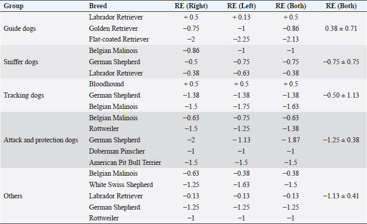 Table 3. Refractive errors (RE) in working dogs by breed (median of right, left, and both eyes) and by working group (median ± interquartile range).
