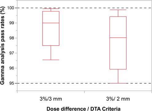 Fig. 2. Box-and-whisker diagram of the differences in gamma-path analysis for two criteria. In the study of changing the criteria of gamma-path analysis, using 20 animals from August to December 2021, the median value of gamma-path analysis was 99.01% (range=96.56%–99.94%) under the conditions of gamma 3%/3 mm, >10%, and the median value of gamma-path analysis was 98.02% (range=95.01%–99.87%) under the conditions of Gamma 3%/2 mm, >10%. There were no statistically significant differences (p=0.08). In recent years, it has been recommended that the gamma analysis pass rate conditions for relative dose distribution verification be 2 mm/3%, and 10% threshold, instead of 3 mm/3%, and 10% threshold (Miften et al., 2018). In this study, we examined the respective gamma analysis pass rates in the last 20 cases and found that the median gamma analysis pass rate was 99.01% (range=96.56–99.94%) for the 3 mm/3%, and threshold 10% conditions, and 98.02% (range=95.01–99.87%) for the 2 mm/3%, and threshold 10% conditions. Although the results of the two conditions were not significantly different and the recommended gamma analysis pass rate of 95% was exceeded in all cases, more stringent conditions will eventually be required as with human medicine. In the future, further study on the conditions of the gamma analysis pass rate is needed in the veterinary field. In this study of IMRT in dogs and cats, we were able to show that the validation results were convincing by adjusting the MLC parameters in all cases of 4 MV and 6 MV. Therefore, in the future, for cases with changes in tumor size and structures during the treatment period, it is recommended that online adaptive radiotherapy is used (Glide-Hurst et al., 2021). We adjusted the MLC parameters necessary for 4-MV and 6-MV IMRT. Our study showed that 4-MV IMRT could be used clinically without complications in dogs and cats. Furthermore, the need for revalidation was reduced when all the dose distributions were within tolerance limits, and IMRT was considered to be possible within appropriate tolerances. AcknowledgmentsNone. FundingThis publication was prepared without any external source of funding. Conflict of interestThe authors declare that there is no conflict of interest. Authors’ contributionsAdjusting the MLC parameters was performed by Toshie Iseri and Yoshinori Tanabe. Radiation therapy was performed by Toshie Iseri, Hiro Horikirizono, and Munekazu Nakaichi. Data organization and analysis were performed by Harumichi Itoh, Hiroshi Sunahara, Yuki Nemoto, Kazuhito Itamoto, and Kenji Tani. Toshie Iseri, Yoshinori Tanabe, and Hidekazu Tanaka were involved in the writing of the first draft, and all authors read and approved the final draft. ReferencesDas, I.J., Cheng, C.W., Watts, R.J., Ahnesjö, A., Gibbons, J., Li, X.A., Lowenstein, J., Mitra, R.K., Simon, W.E. and Zhu, T.C. 2008. TG-106 of the Therapy Physics Committee of the AAPM. Accelerator beam data commissioning equipment and procedures: report of the TG-106 of the Therapy Physics Committee of the AAPM. Med. Phys. 35, 4186–4215. Glide-Hurst, C.K., Lee, P., Yock, A.D., Olsen, J.R., Cao, M., Siddiqui, F., Parker, W., Doemer, A., Rong, Y., Kishan, A.U., Benedict, S.H., Li, X.A., Erickson, B.A., Sohn, J.W., Xiao, Y. and Wuthrick, E. 2021. Adaptive radiation therapy (ART) strategies and technical considerations: a state of the ART review from NRG Oncology. Int. J. Radiat. Oncol. Biol. Phys. 109, 1054–1075. Grofsmid, D., Dirkx, M., Marijnissen, H., Woudstra, E. and Heijmen, B. 2010. Dosimetric validation of a commercial Monte Carlo based IMRT planning system. Med. Phys. 37, 540–549. Kinsella, P., Shields, L., McCavana, P., McClean, B. and Langan, B. 2016. Determination of MLC model parameters for Monaco using commercial diode arrays. J. Appl. Clin. Med. Phys. 17, 37–47. Kitagawa, K., Reich, S.N., Desai, N., Policelli, R., Zimmerman, A., Sledge, D. and Vilar Saavedra, P. 2020. Outcome of a dog undergoing definitive-intent intensity-modulated radiation therapy for an intranasal ganglioneuroma. Vet. Radiol. Ultrasound. 61, E50–E54. Kleiner, H. and Podgorsak, M.B. 2016. The dosimetric significance of using 10 MV photons for volumetric modulated arc therapy for post-prostatectomy irradiation of the prostate bed. Radiol. Oncol. 50, 232–237. Mazonakis, M., Kachris, S. and Damilakis, J. 2021. VMAT for prostate cancer with 6-MV and 10-MV photons: Impact of beam energy on treatment plan quality and model-based secondary cancer risk estimates. Mol. Clin. Oncol. 14, 89. Miften, M., Olch, A., Mihailidis, D., Moran, J., Pawlicki, T., Molineu, A., Li, H., Wijesooriya, K., Shi, J., Xia, P., Papanikolaou, N. and Low, D.A. 2018. Tolerance limits and methodologies for IMRT measurement-based verification QA: Recommendations of AAPM Task Group No. 218. Med. Phys. 45, e53–e83. Nelms, B.E., Chan, M.F., Jarry, G., Lemire, M., Lowden, J., Hampton, C. and Feygelman, V. 2013. Evaluating IMRT and VMAT dose accuracy: practical examples of failure to detect systematic errors when applying a commonly used metric and action levels. Med. Phys. 40, 111722. Roche, M., Crane, R., Powers, M. and Crabtree, T. 2018. Agility MLC transmission optimization in the Monaco treatment planning system. J. Appl. Clin. Med. Phys. 19, 473–482. Shende, R. and Patel, G. 2017. Validation of Dosimetric Leaf Gap (DLG) prior to its implementation in Treatment Planning System (TPS): TrueBeam™ millennium 120 leaf MLC. Rep. Pract. Oncol. Radiother. 22, 485–494. Shukla, A.K., Oinam, A.S., Kumar, S., Sandhu, I.S. and Sharma, S.C. 2013. A calibration method for patient specific IMRT QA using a single therapy verification film. Rep. Pract. Oncol. Radiother. 18, 235–240. | ||