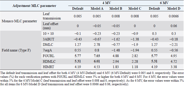 Open Vet. J.. 2022; 12(3): 407-413 Open Veterinary Journal, (2022), Vol. 12(3): 407–413 Original Research Adjustment of multi-leaf collimator parameters in 4-MV and 6-MV IMRT: A study of veterinary clinical casesToshie Iseri1, Yoshinori Tanabe2*, Hiro Horikirizono1, Hiroshi Sunahara1, Harumichi Itoh1, Yuki Nemoto1, Kazuhito Itamoto1, Kenji Tani1, Hidekazu Tanaka3 and Munekazu Nakaichi11Joint faculty of Veterinary Medicine, Yamaguchi University, Yamaguchi-shi, Japan 2Faculty of Medicine, Graduate School of Health Sciences, Okayama University, Okayama, Japan 3Faculty of Medicine and Health Sciences, Yamaguchi University, 1-1-1 Minami-Kogushi, Ube-shi, Japan *Corresponding Author: Yoshinori Tanabe. Faculty of Medicine, Graduate School of Health Sciences, Okayama University, 5-1 Shikata-cho, 2-chome, Kita-ku, Okayama, 700-8558, Japan. Email: tanabey [at] okayama-u.ac.jp Submitted: 20/04/2022 Accepted: 25/05/2022 Published: 21/06/2022 © 2022 Open Veterinary Journal