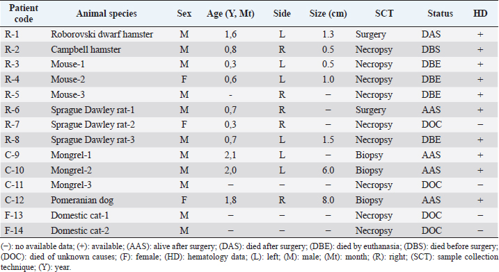 For IHC, the slide was deparaffinized and rehydrated using xylene and alcohol. The slide was retrieved using antigen retrieval solution (RE7113-CE, Leica Biosystem) and applied using the primary antibody against PAX8 (sc-81353, Santa Cruz, CA) and CK7 (sc-23976, Santa Cruz, CA). Further, the slides were processed following a previous study (Prakoso et al., 2020). The slides were retrieved using an antigen retrieval solution at 98°C for 20 minutes. The slides were then incubated using peroxidase block and protein block. After that, they were incubated using a primary antibody (antibody anti-PAX8 and CK7), post-primary antibody, chromogen, and counter-stain. The slides were covered using Entellan and cover slip. The staining result was then analyzed using a light microscope (CX-33 Series, Olympus, Japan). MorphometryThe morphometry of H&E slides was analyzed by a senior pathologist. The mitotic count was measured and standardized using the Fuhrman grading system (Edmondson et al., 2015). The Fuhrman grading system was based on the nuclear and nucleolar morphology with four grades from grades I, II, III, and IV. In contrast, the IHC was analyzed and measured using a simple scoring system. The area that showed the immune expression of PAX8 and CK7 was scored as: 1 (immune-expressed) and 2 (no immune-expressed) (Palgunadi et al., 2019). Analysis dataThe data of hematology were qualitatively analyzed and the interpretation of each hematological parameter was reported as a percentage. The data of histopathology were reported qualitatively and the immunohistochemical score was reported as the percentage. Further, the correlation between each parameter was analyzed using Fisher’s exact test (Kim, 2017). All the statistical analysis was performed using Statistical Package for the Social Sciences version 26 with a p-value=0.05. Ethical approvalThe ethical clearance committee from the Faculty of Dentistry, University of Airlangga, Surabaya has approved this study with registration number: 226/HRECC/FODM/IV/2020. All the samples were collected under the supervision of the veterinary clinician and veterinary pathologist. In addition, the owners’ informed consent was received before the specimens were collected from pets. ResultsClinical characteristics of animalsThe sRCC predominantly occurred in rodents (eight cases), dogs (four cases), and cats (two cases). The rodents that suffered from sRCC were experimental rodents 75% and pet rodents (12.5% of Roborovski dwarf hamsters and 12.5% of Campbell hamsters). The experimental rodents were not showed any clinical signs; however, it was identified after the kidney tissue was diagnosed by the pathologist. In contrast, the pet rodents showed hematuria and anorexia. One of the pet rodents died before the surgery and the other one died after surgery. Unfortunately, there are only minimal data regarding the occurrence of sRCC in either canines or felines. During the past 5 years, there are only four cases of sRCC in dogs and two cases in cats (Table 1). Hematology and serologyBased on the hematological test, various hematology changes are being observed including anemia, thrombocytosis, thrombocytopenia, hyperproteinemia, leukopenia, lymphocytosis, monocytosis, neutrophilia, uremia, hypercreatinemia, elevated AST and ALT (Table 2). Unfortunately, the hematological data were only available in 10 animals (7 rodents and 3 dogs) from a total of 14 animals (Table 1). The detail of the hematological result was shown in Table 2. Table 2. Hematological result of the selected animals.