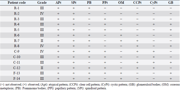 HistopathologyThe tumor predominantly showed solid architecture in all collected animals. The sRCC was characterized by the gradual transition of the epithelial cells into elongated atypical spindle cells. Based on its appearance, we determined it as a pure sRCC. In contrast, there are several slides of sRCC that also showed the other patterns that are similar to the other type of RCC have been categorized as mixed sRCC or dedifferentiated sRCC. From a total of 14 specimens, there are 2/14 have been categorized as grade II, 9/14 (grade III), and 3/14 (grade IV). The other patterns include clear cells, tubule-cystic, and papillary patterns (Table 3). Furthermore, the histopathological appearance of sRCC in rodents demonstrated the dual morphology either, normal or neoplastic depending on the grade of the tumor. Some of them showed that the neoplastic tissue depressed the normal tissue from the center to the edge (Fig. 1a). The abnormal mitotic figure (Fig. 1a), fibrous histiocytoma-like cells (Fig. 1b), emperipolesis (Fig. 1c), and osseous metaplasia (Fig. 1d) have been identified in rodents. Moreover, the cystic and papillary architecture was also observed in the dogs’ kidneys (Fig. 2a–c). In cats, the sRCC presented osseous metaplasia with glomeruloid bodies (Fig. 3a and b) and eosinophilic cytoplasm with psammoma bodies (Fig. 3c and d). ImmunohistochemistryThis study used two types of IHC markers including PAX8 and CK7. Those two IHC markers represented various results regarding their positivity and negativity immune reactions. From a total of 14 samples, as many as 13 (92.85%) samples were positive against PAX8 except for one sample from the SD rat-3. In contrast, the expression of CK7 was only detected in 3/14 (21.42%) samples. Those samples were Roborovski dwarf hamster, SD rat-2, and Pomeranian dog (Table 4). Correlation between parametersThe result showed that there is no correlation between the type of sRCC (pure and dedifferentiated) with the species of animals with p=0.30 (p ≥ 0.05). It indicated that the occurrence of the sRCC is not dependent on the animal species. Further, the type of sRCC does not correlate with the sex, hematology, and serology of the collected samples (Table 5). The immune expression of PAX8 that consistently expressed on the tumor tissue however, it has no correlation with the type of sRCC as well as CK7 (Table 6). DiscussionThe incidence of sRCC in animals is relatively rare and similar to the incidence of this disease in humans. The sRCC is spontaneously occurring in animals with no understanding of the disease etiology. This study shows that the most frequent cases occur in rodents especially, experimental rodents (6/8). The anamnesis showed that most experimental rodent samples were collected during euthanasia (66.66%) and accidentally diagnosed as sRCC. It is similar to the occurrence of sRCC in cats in this study. Only one sample from the dog (Pomeranian dog) showed clinical signs such as hematuria and anorexia. This study proves that the animals can be suffering from sRCC without specific clinical signs and commonly they were diagnosed after the sample was collected. Table 3. Histopathology finding of sRCC in the selected animals.