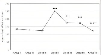 Fig. 1. Effect of CUS on MDA level of the hippocampus in control groups and experimental groups. p < 0.001♦♦♦; Group I versus Group II; p < 0.001✞✞✞: Group II versus Group IIa; p < 0.001♠♠♠: Group II versus Group IIb; p < 0.001# # #: Group II versus Group IIc; p < 0.001***; Group IIa versus Group IIc. Table 1. Effect of CUS on biochemical parameters of the hippocampus in control groups and experimental group.