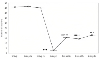 Fig. 3. Effect of CUS on the neuronal count in the frontal cortex in the control group and experimental groups. p < 0.001♦♦♦; Group I versus Group II; ◈◈◈; Group Ia versus Group IIa; p < 0.001✞✞✞: Group II versus Group IIa; p < 0.001♠♠♠: Group II versus Group IIb; p < 0.001# # #: Group II versus Group IIc; p < 0.001***; Group IIa versus Group IIc; † † † Group Ic versus Group IIc.