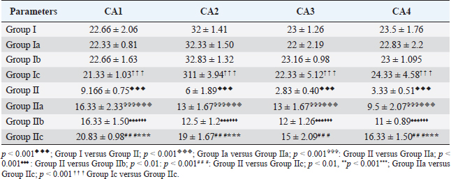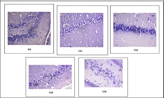 Fig. 6. Distribution of neuronal count in different regions of the hippocampus in CUS-induced cod liver oil treated group (Group IIb). Table 2. Effect of CUS on neuronal count on various regions of hippocampus in control groups and experimental groups.