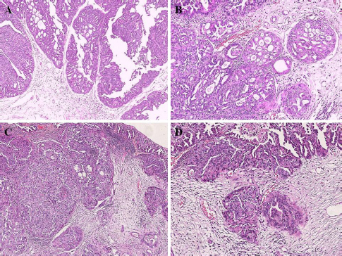 Fig. 1. Histological type photomicrograph of canine UC. (A) UC papillary (case 4) (H&E, 5× magnification). (B) The tumor “A,” focusing on tumor infiltration (H&E, 10× magnification). (C) UC non-papillary and infiltrating (case 21) (H&E, 5× magnification). (D) The tumor “C,” focusing on tumor infiltration (H&E, 10× magnification).