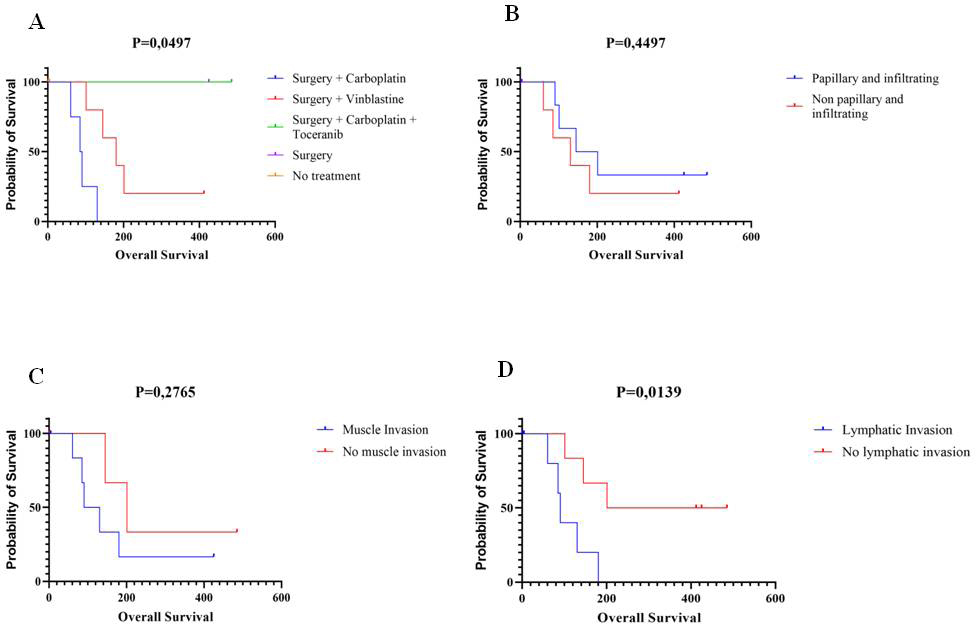 Survival analysis was carried out in association with the following parameters: type of treatment, histological subtype, histological grade, presence of muscle invasion, and presence of lymphatic invasion. Of the 32 animals included in the study, survival data (in days) of 13 animals were obtained. Of the 13 animals with bladder UC, 1 died due to post-surgical complications (4-day survival), and another 1 underwent euthanasia during surgery, due to the finding of an advanced stage disease, incompatible with less radical techniques of surgical tumor removal (1-day survival). The highest survival was 485 days for an animal that is still alive (treated with surgery + carboplatin + tyrosine kinase inhibitor), and the mean overall survival was 178.38 ± 161.05 days.