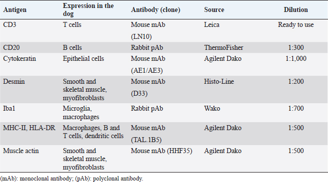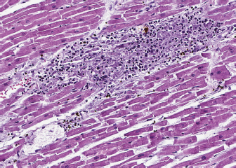Fig. 2. Heart, dog. Myocardial interstitium is infiltrated by lymphocytes, with myofiber degeneration and necrosis. Hematoxylin and eosin. A necropsy was performed. The main macroscopic finding consisted of a diffused megaesophagus. Low numbers of white, small-sized spots were also visible on the myocardial surface, with random distribution. The subsequent histology of the heart showed that myocardium was infiltrated by a severe multifocal to coalescing inflammatory process, mainly composed of lymphocytes, admixed with a lower number of macrophages, plasma cells and neutrophils, and rare giant multinucleated cells, with up to five haphazardly arranged nuclei. Inflammatory infiltrate was associated with small foci of necrotic cardiomyocytes with hypereosinophilic cytoplasm, loss of cross striations and pyknotic nuclei (Fig. 2). A similar inflammatory process consisting of multiple, variably sized foci of necrotizing myositis also involved esophageal and diaphragmatic skeletal muscle. Immunohistochemistry (IHC) was performed to characterize the inflammation involving the myocardium, esophagus and diaphragmatic skeletal muscle: the inflammatory cell population infiltrating the myocardium was mainly composed of CD3+ lymphocytes (T cells), admixed with a lower number of Iba1 positive macrophages, most of them being MHC-II positive. Rare, scattered B lymphocytes expressed CD20. Interestingly, a low proportion of cardiomyocytes expressed MHC-II in the cytoplasm or on the sarcolemma. Esophageal and diaphragmatic skeletal muscles were also characterized by an infiltration of T lymphocytes and macrophages. The histopathological picture was consistent with lymphocytic and necrotizing myocarditis and polymyositis. Based on this evidence, to exclude possible infectious causes, PCR for the detection of Toxoplasma gondii and Neospora caninum was carried out on myocardial samples and results came out negative. DiscussionMG is an autoimmune disorder that is often the result of a paraneoplastic syndrome related to the presence of thymoma (Valli et al., 2016). The target of the autoantibodies is ACHRs, but autoantibodies can also be directed against muscular proteins, like actin, ryanodine, and titin receptor, and they are called antistriational antibodies. Therefore, antistriational antibodies potentially indicate the presence of a pathological process that, in addition to the ACHR antibody mediated NMJ transmission defect, can influence both striated and cardiac muscle function (Suzuki et al., 2011). Many studies demonstrated that disease tends to be more severe in MG patients found to be positive for antstriational antibodies than in those found to be negative (Suzuki et al., 2013; Kon et al., 2013; Priemer et al., 2018). Moreover, an association between the presence of antistriational antibodies and the occurrence of other clinical syndromes such as polymyositis and/or myocarditis in MG thymoma associated patients is reported (Suzuki et al., 2011). Giant cell myocarditis (GCM) is a rare, lethal, and well-recognized syndrome in these patients (Shivamurthy and Parker, 2014). Although the pathogenesis is uncertain, an autoimmune process, possibly elicited by antistriational antibodies, has been suggested. Histologically GCM is a severe form of myocarditis characterized by myocardial degeneration of varying degrees up to myonecrosis and by widespread interstitial infiltrate of chronic inflammatory cells (Suzuki et al., 2011; Shivamurthy and Parker, 2014). The inflammatory infiltrate is characterized by CD3 and CD8 positive T lymphocytes often admixed with numerous multinucleated giant cells (Kon et al., 2013; Saito et al., 2013), which are reported to express desmin or CD68, therefore suggesting myocytic and histiocytic origins (Kon et al., 2013). Clinically, most human patients deteriorated rapidly with lethal arrhythmias and severe heart failure and died despite intensive treatments (Suzuki et al., 2011; Shivamurthy and Parker, 2014). In veterinary medicine, Shelton et al. (2001) documented antistriational antibodies against titin and RyR in dogs with MG thymoma associated and found an association between the presence of RyR antibodies and more severe disease. An association between MG thymoma associated and polymyositis has also been described in the dog (Darke et al., 1975; Aronshon et al., 1984), while there are no reports of MG with associated GCM or myocarditis. Third-degree atrial ventricular heart block has been described in some dogs with MG thymoma associated, but in these cases, an idiopathic cardiac conduction disturbance was hypothesized (Hackett et al., 1995). In the present report, myocarditis was suspected as a pathological mechanism of the patient's severe arrhythmia, and the marked increase in serum troponins supported this diagnostic hypothesis. Post-mortem myocardial histological examination confirmed the association between third-degree heart block and myocarditis. According to cells morphology, the myocarditis exhibited by the dog is similar to the human GCM type, and the detected histopathological picture could represent a GCM variant in dogs: both entities are characterized by infiltration of CD3 lymphocytes, associated with myofiber damage. Compared to GCM, case a lower number of giant multinucleated cells was detected in the present. Supporting the presence of an immune-mediated mechanism was also the expression of MHC II on the sarcolemma of myocardial cells. The muscle tissue does not usually express MHC II in healthy conditions, and its expression is typical of immune-mediated diseases, even though it is not exclusive (Paciello et al., 2007; Durward-Akhurst and Valberg, 2018). This histological type of inflammatory myopathy, already reported in skeletal muscles of dogs with polymyositis and MG associated thymoma (Darke et al., 1975; Shelton et al., 2001), is similar to that described in polymyositis of human patients with thymoma and MG (Kon et al., 2013). The severe increase 