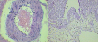 Fig. 1. Presence of marked myointimal hyperplasia (left) of an intromyocardiac coronary arteriole. Fatty transmural replacement of the free wall of the left ventricle (right). Both sections were stained with hematoxylin-eosin.