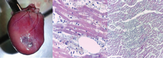 Fig. 2. Heart of a cat with a thinned area of the free wall of the left ventricle due to subendocardial infarction (left). Histopathological alterations compatible with acute myocardium infarction with polymorphonuclear infiltrations (middle). Changes suggesting chronic myocardium infarction with fibrosis areas distributed in a patchy pattern (right).