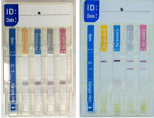 Fig. 2. The BoviD-4 Ag test device, (a) before adding the sample in the sample hole and (b) after adding a sample, showed a positive result for Cryptosporidim and RVA antigens (both “C” and “T” lines appeared) and negative for coronavirus and E. coli antigens (only the “C” line appeared).