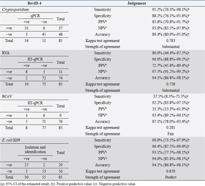 Methods: A total of 85 samples were examined using BoviD-4, and the results were compared with that of polymerase chain reaction for Cryptosporidium, RVA, and BCoV, whereas for E. coli K99 it was by isolation and identification as reference tests.
