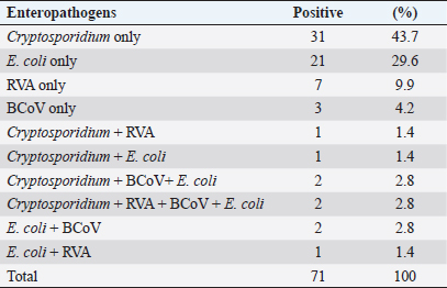 Examination of fecal samples of small ruminants revealed that single infections with Cryptosporidium, E. coli K99, RVA, and BCoV were diagnosed in 43.7%, 29.6%, 9.9%, and 4.2%, respectively. Mixed infections with all the pathogens were detected in 2.8%, and three pathogens (Cryptosporidium, BCoV, and E. coli) were found in 2.8% of the examined samples. Coinfections with two enteropathogens also were reported, as shown in Table 2.
