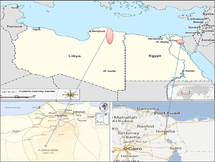 Fig. 1. Geographical map for Ismailia governorate, Egypt, and Al Gabal Al Akhdar in Libya. Table 1. Tick specimens collected from examined animals.