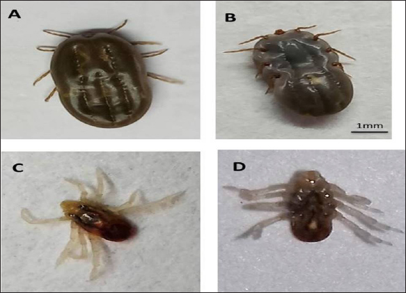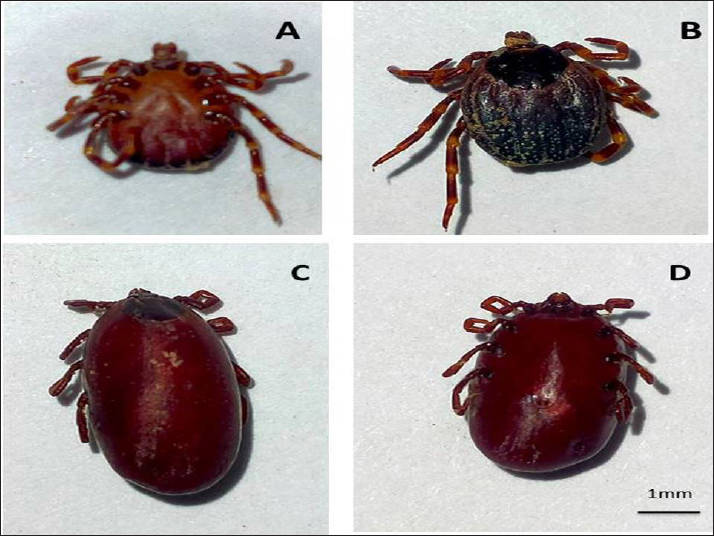 Fig. 2. (A): Ventral view of H. marginatum male. (B): Dorsal view of H. marginatum, male. (C): Dorsal view of H. marginatum, engorged female. (D): Ventral view of H. marginatum, engorged female.