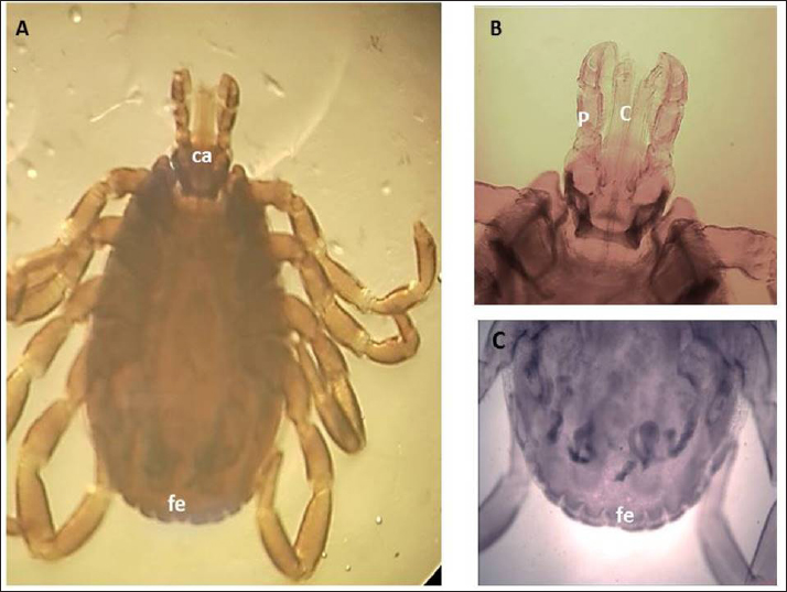 Fig. 3. LM of permanent slide of H. marginatum, male. (A): Dorsal view. (B): Anterior part. (C): Posterior part. (Sp): Spicular plate; (fe): festoon; (ca): capituli; (c): Chelicera; (P): palpai. Rhipicephalus annulatus (Say, 1821): was characterized by a weakly indistinct anal groove. The male had adenal and accessory adenal shields without a caudal process (Fig. 4). The basis capitulum was hexagonal in shape and laterally produced. Palpi were very short, consisting of four segments. Mouth parts were as long as the basis capitulum. The second segment of the palpi was as long as it was wide and was not produced laterally. Caudal appendages and festoons were absent (Fig. 4). The spiracular plate had an oval shape and was made up of stigma and peritreme. Coxa 2, 3, and 4 had no external spurs, while coxa 1 was broad with internal and external spurs. The genital aperture posterior lips had a broad U shape (Fig. 5). Rhipicephalus bursa (Canestrini and Fanzago, 1878): was characterized by dark-colored scutum (Fig. 6). The male had broad adenal and small accessory shields (Fig. 6). The basis capitulum lateral angles were sharply produced. Palp pedicles were short and festoons were present (Fig. 6). The spiracular plate was comma shaped and consisted of a stigma, peritreme, and a tail. In Coxa 1 anterior spurs were visible dorsally, and the genital aperture posterior lips had a narrow V shape (Fig. 7). Molecular identification of tick speciesA total of 100 tick samples were analyzed (Fig. 8) which were collected from Egypt and Libya. They were identified based on the16S rDNA PCR products as H. marginatum, R. bursa, and R. annulatus, the GenBank accession numbers are OM661198, OM661199, OM661200, and OM661201. Phylogenetic analysisThe phylogenetic analysis based on the 16S rDNA gene was performed using MEGA X10.1 software and the trees were constructed using neighbor-joining (NJ) methods (Fig. 9). There is a low degree of sequence variations was observed within most of the species of R. annulatus from Egypt, Sudan, and Cameroon since they all clustered into one original branch, and low variation between the present R. annulatus samples from Egypt (Fig.10). While H. marginatum sequence of our study had a close relationship and clustered with the same species from Turkey (Figs. 9 and 10). DiscussionIn Ismailia, Egypt, the overall prevalence of tick infestation was 23.9% in cattle and buffaloes, whereas in Al Gabal Al Akhdar, Libya, the overall prevalence of tick infestation was 47% in cattle, sheep, and goats. The difference in tick distribution may be attributed to the difference in environmental conditions, host density, host susceptibility, grazing habits, and pasture herd management (Pegram et al., 1981). In addition, the highest prevalence of tick infestation was observed in sheep and goats (59%). This may be attributed to the fact that tick infestation is facilitated by a large livestock population and herd size, as ticks can easily gain access to hosts and complete their life cycle quickly. Poor veterinary service and herders’ disregard for animal management practices may also contribute to tick infestation (Alessandra and Santo, 2012).