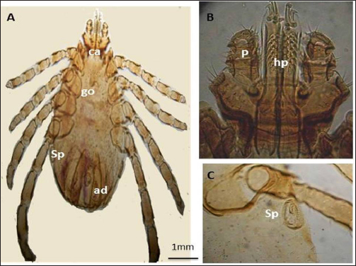 Fig. 5. LM of permanent slide of R. annulatus male. (A): Dorsal view. (B): Anterior part. (C): Specular plate. (Sp): Spicular plate; (go): genital opening; (ca): capituli; (hp): hypostome; (P): palpai; (ad): adenal shield.