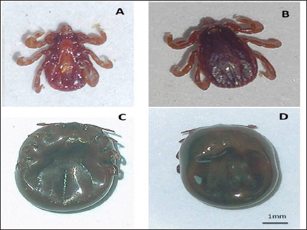 Fig. 4. (A): Dorsal view of R. annulatus, engorged female. (B): Ventral view of R. annulatus, engorged female. (C): Dorsal view of R. annulatus, male. (D): Ventral view of R. annulatus, male.