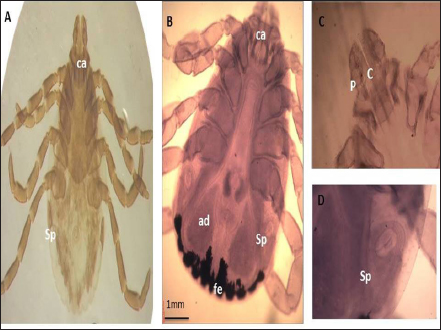 Fig. 7. LM of permanent slide. (A): Ventral view of R. bursa female. (B): Ventral view of R. bursa, male. (C): Anterior part. (D): Specular plate. (Sp): Spicular plate; (ca): capituli; (C): chelicera; (P): palpai; (ad): adenal shield. The difference in the prevalence of tick species may be due to the different environmental conditions and nature of the land as well as the management style and season of sample collection. It is reported that tick activity can be influenced by rainfall, altitude, season, and atmospheric relative humidity (Pegram et al., 1981). The collected ticks from cattle, sheep, and goats were identified as Hyalomma sp. and Rhipicephalus sp. at Al Gabal Al Akhdar in Libya. The higher prevalence of R. sanguineus in this study may be attributed, in our opinion, to high temperatures in these localities, as they are the greatest and most important factor for the development of this tick species (Dantas-Torres et al., 2010). Furthermore, there is no significant difference between the infestation rate and the changes in localities of R. sanguineus. This may be due to its adaptation to the environment in each locality. This corroborates well with Dantas-Torres et al. (2010), who stated that the wide geographical distribution of the brown dog tick; R. sanguineus was related to the cosmopolitan distribution of its primary host and to its adaptability to different environments, under variable climatic conditions.