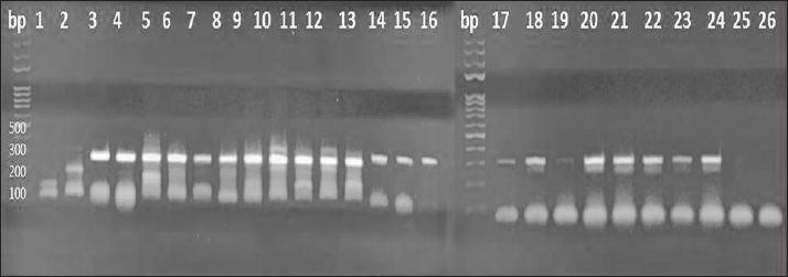 Fig. 8. PCR amplification utilizing tick samples of different species using: 16S rDNA Gene, DNA ladder is located on the left sides of the gel, fragment sizes are represented in base pairs (bp), 1: 25 tick samples, and 26: negative control.