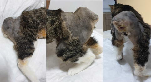 On clinical examination, the cat was in moderate general condition. On inspection, an asymmetry in the pelvic region was noted, and a fluctuant mass in the right dorso-lateral region of the pelvis could be palpated (Fig. 1). The urinary bladder could not be detected on abdominal palpation. On rectal palpation, the cat showed pain, and the mass noticeable from the outside was felt in the right dorsolateral pelvic region, and some faeces were detected. However, perineal muscle structures and anal reflexes could not be determined. The pelvis's right-lateral and ventral-dorsal radiographs revealed sacrococcygeal avulsion with a left caudodorsal dislocation of the sacral vertebrae. There was sacroiliac separation with cranial dislocation of the right hemipelvis.